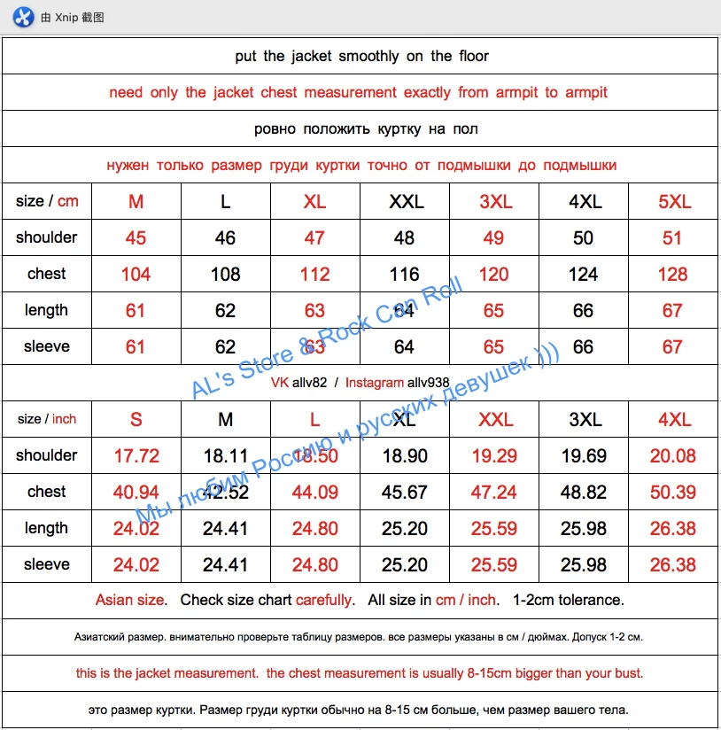Пожалуйста, проверьте таблицу размеров и измерьте вашу куртку, как показано ниже.