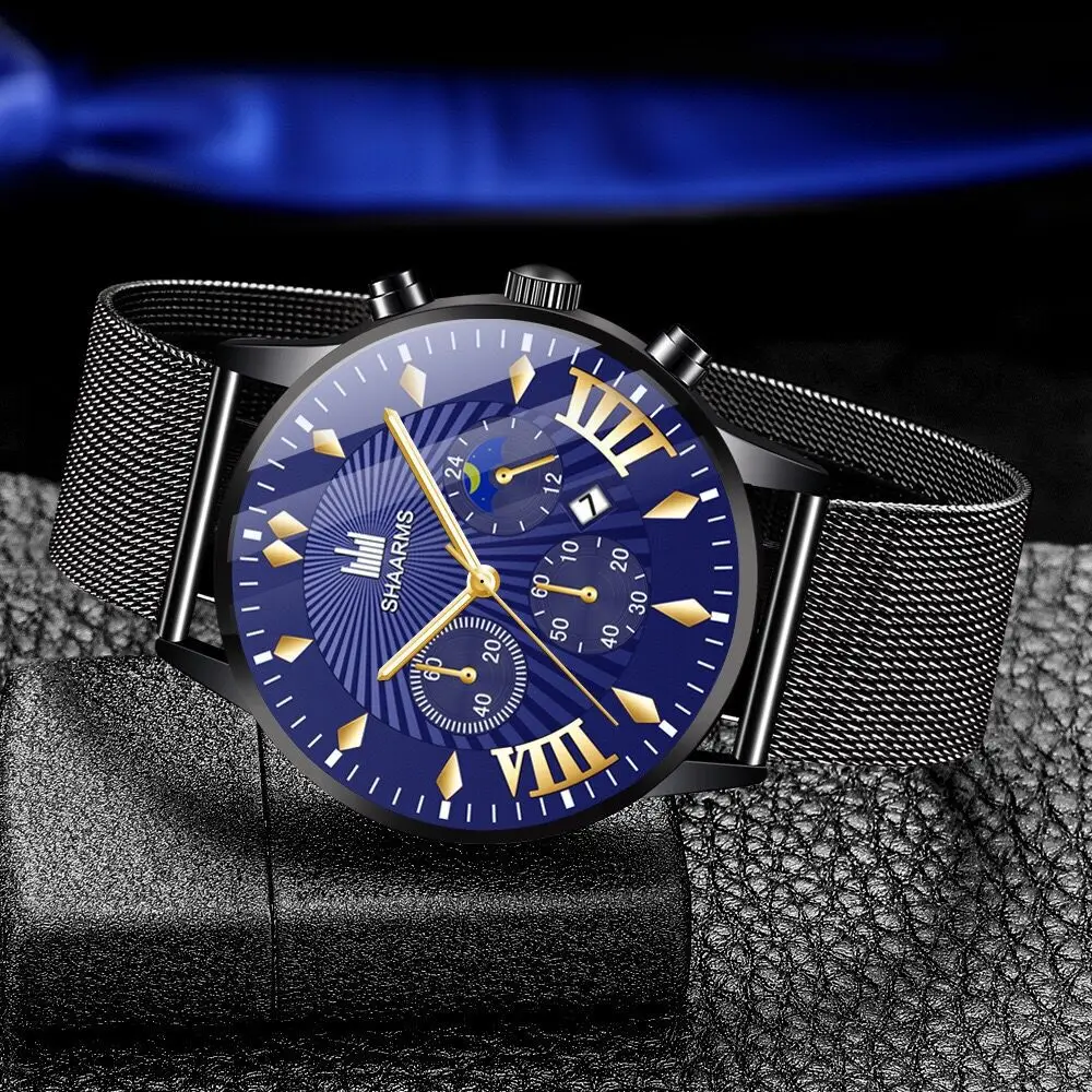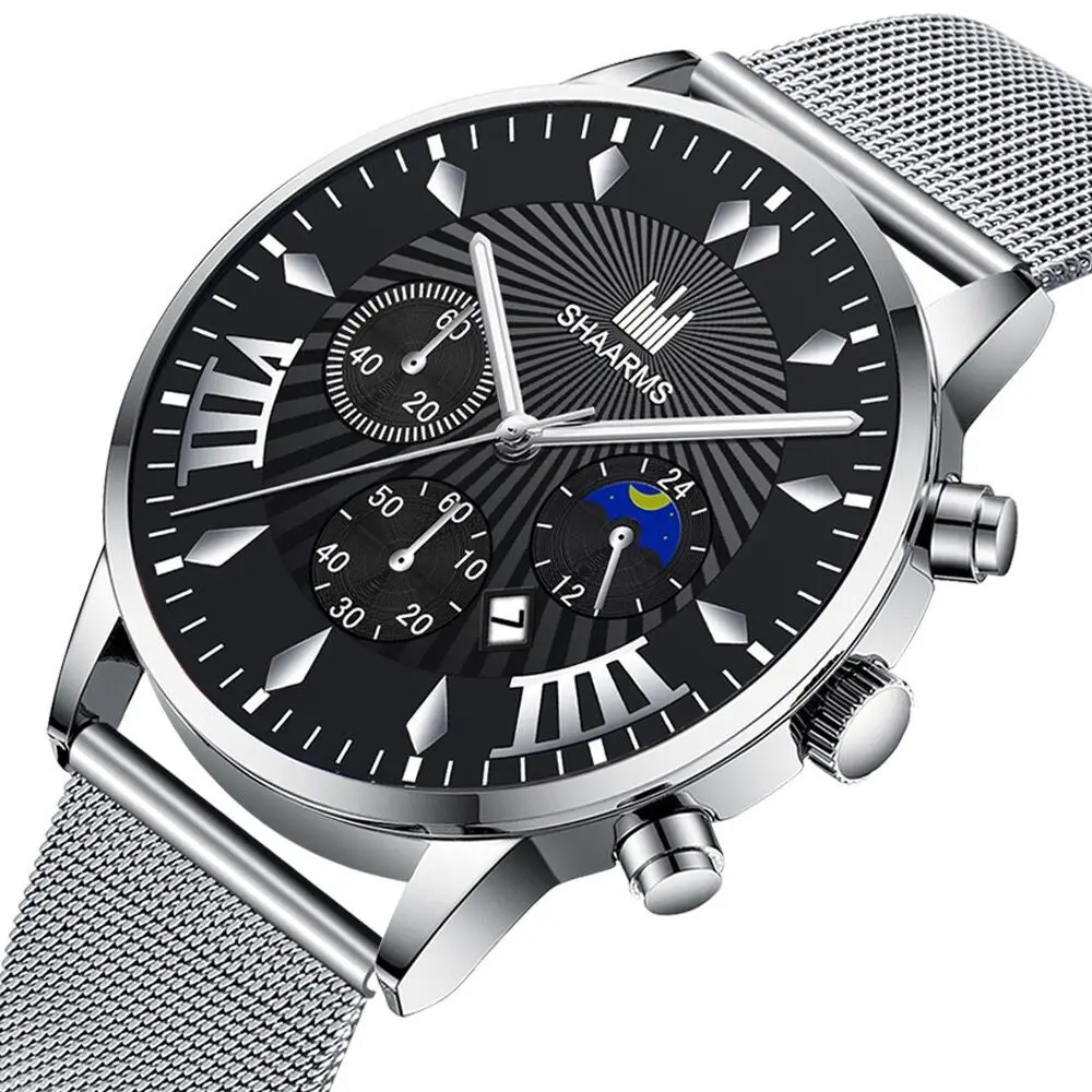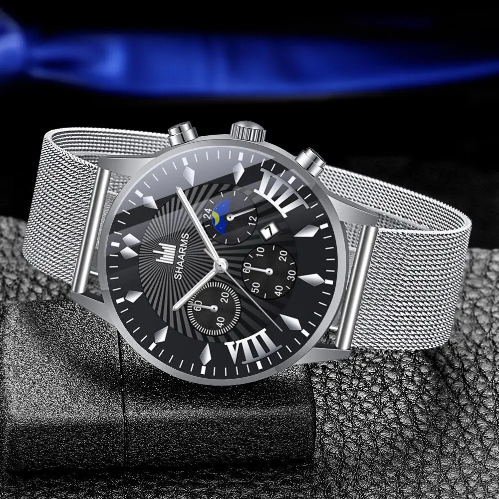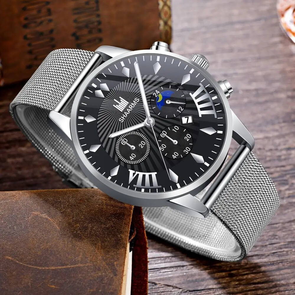 Часы мужские кварцевые в стиле Луны, водонепроницаемые наручные часы с ремешком-сеткой с магнитной пряжкой, с тройным циферблатом, 2021