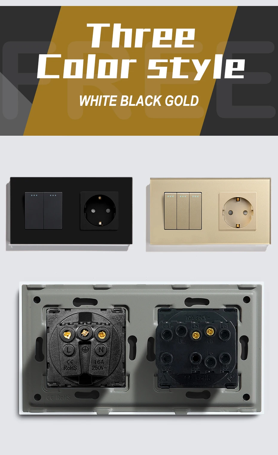 BSEED Настенные переключатели Кнопка 1/2/3 комплекта, 1Way Европейская Сетевая розетка с украшением в виде кристаллов Стекло механические настенные переключатели ЕС Стандартный Цвет: белый, черный, золотой