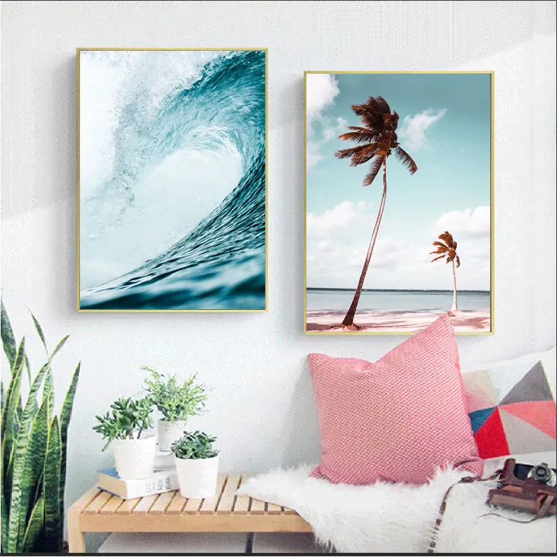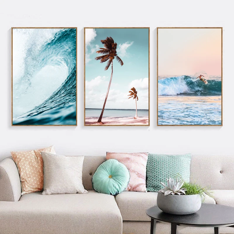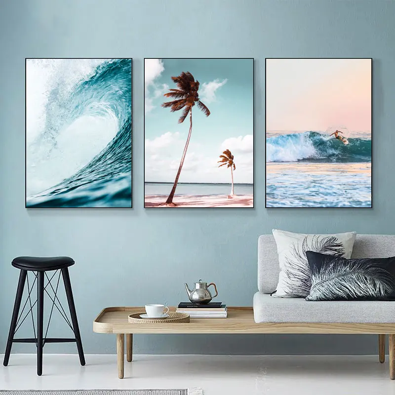 Скандинавский стиль, море, фотообои с рисунком волн, пляж, пальма, настенные картины для декора гостиной