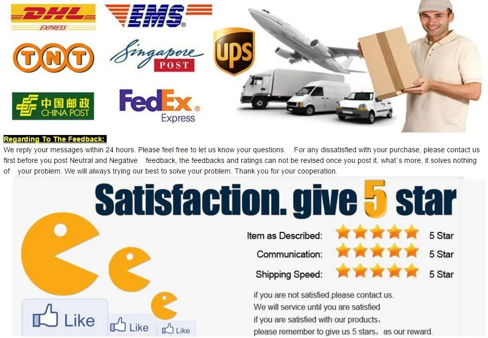 1) Если вы заказываете менее $5, мы предоставим трек-номер, который отслеживается только в Китае, или доплатить $1,5 мы можем предоставить номер отслеживания, который может быть отслежен до доставки (в том случае, если количество ваш заказ свыше $5, мы не будем взимать $1,5 от вас), спасибо за понимание! 2) (налог на добавленную стоимость)-это ответственность покупателя. Однако мы сделаем все возможное, чтобы минимизировать это. 3) Если вы хотите более быстрый способ доставки, например, DHL EMS. Пожалуйста, свяжитесь с нами. 4) Доставка по подтвержденным адресам заказа, покупатель, пожалуйста, свяжитесь с нами через сообщение, чтобы уведомить о любом измененном адресе Оплата 1) Мы принимаем Alipay, West Union, TT. Все основные кредитные карты принимаются через безопасный платежный процессор ESCROW. 2) оплата должна быть произведена в течение 3 дней с момента заказа. 3) Если вы не можете проверить немедленно после окончания аукциона, рекомендуем подождать несколько минут и повторить. Платежи должны быть завершены в течение 3-х дней. Отгрузка 1) доставка по всему миру. (За исключением некоторых стран и армейской почтовой службы/почтовых отделений флота) 2) Заказы обрабатываются своевременно после подтверждения оплаты. 3) Мы отправляем только по подтвержденным адресам заказа. Ваш адрес заказа должен совпадать с вашим адресом доставки. 4) представленные изображения не являются фактическим товаром и предназначены только для справки. 5) Время доставки определяется перевозчиком и не включает выходные и праздничные дни. Сроки доставки могут меняться, особенно во время курортного сезона. 6) Если вы не получили посылку в течение 60 дней с момента оплаты, пожалуйста, свяжитесь с нами. Мы отследим отправку и свяжемся с вами как можно скорее. Наша цель – удовлетворение клиентов! 7) из-за наличия на складе и разницы во времени, мы выберем доставку Вашего товара с нашего первого доступного склада для быстрой доставки. Возврат и возврат 1) у вас есть 7 дней, чтобы связаться с нами и 7 дней, чтобы вернуть его с даты получения. Если данный товар находится в вашем распоряжении более 7 дней, он считается пользованным товаром и МЫ НЕ ПРОИЗВОДИМ ВОЗВРАТ ИЛИ ЗАМЕНУ. Исключений нет! Стоимость доставки оплачивается как продавцом, так и покупателем пополам. 2) Все возвращенные товары должны быть в оригинальной упаковке, и вы должны предоставить нам номер отслеживания доставки, конкретную причину возврата и ваш po #. 3) Мы вернем вам полную сумму выигрышной заявки при получении товара в его первоначальном состоянии и упаковке со всеми компонентами и аксессуарами, после того как покупатель и продавец отменят сделку с aliexpress. Или вы можете выбрать замену. 4) Мы будем нести все расходы по доставке, если товар (ы) является (являются) не как рекламируется. Гарантия 1) 12 месяцев ограниченной гарантии производителя на дефектные изделия (за исключением предметов, поврежденных и/или неправильно использованных после получения). Аксессуары поставляются с 3-месячной гарантией. 2) дефектные предметы должны быть зарегистрированы и возвращены в течение гарантийного срока (и в оригинальной упаковке, если это возможно). Вы должны описать дефект и предоставить номер вашего заказа. Мы не ремонтируем и не заменяем товары с истекшим сроком гарантии. Оставляя заказ на Aliexpress, вы соглашаетесь со всеми приведенными выше п