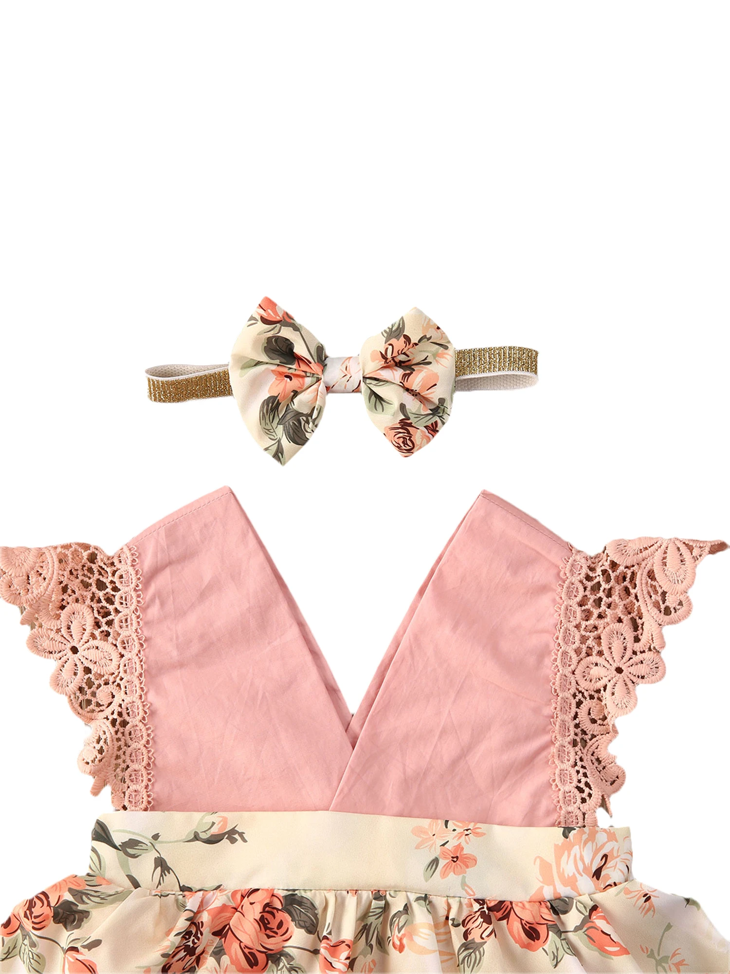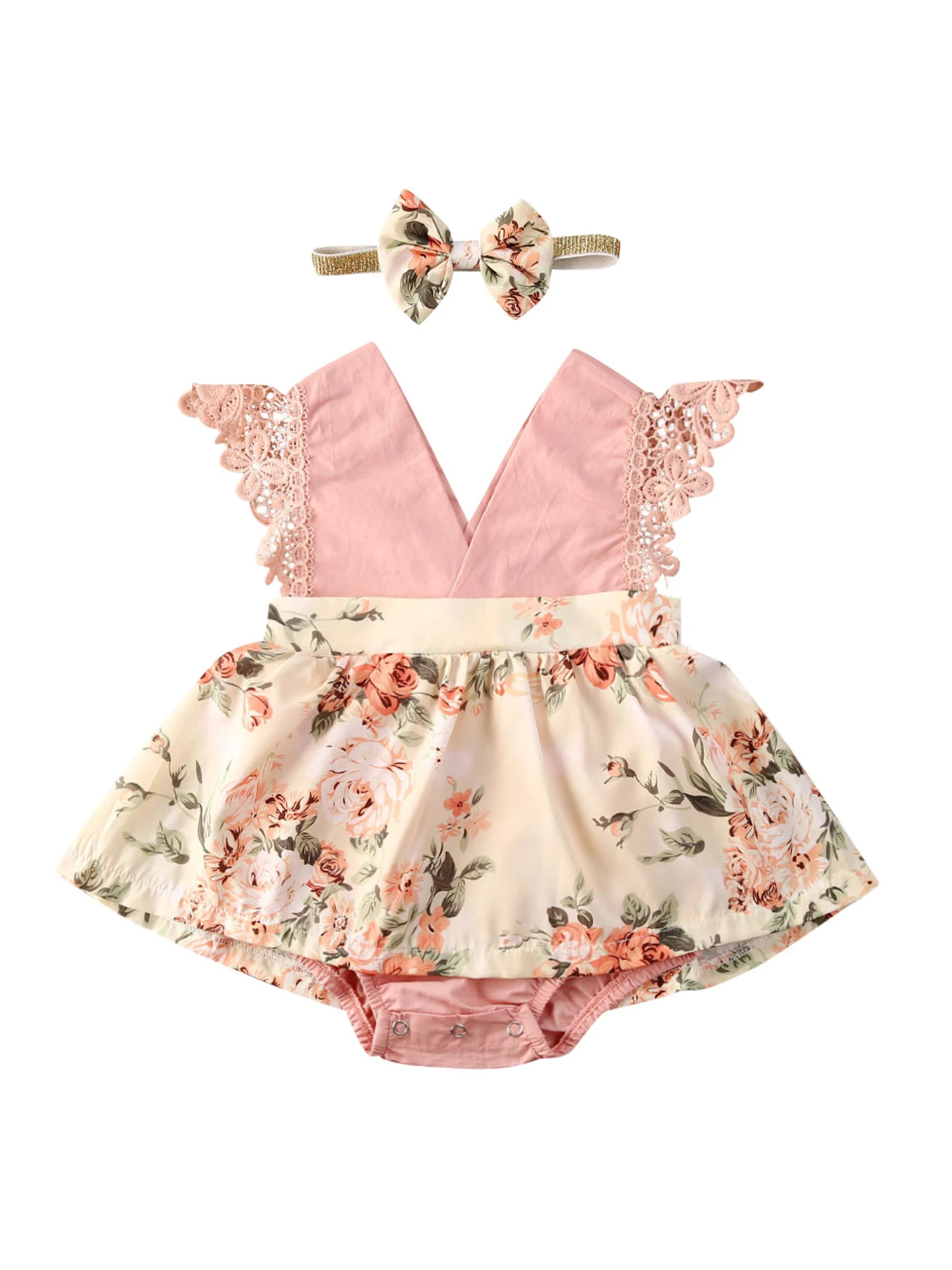 Летний комплект одежды для маленьких девочек комбинезон без рукавов с цветочным принтом и кружевом розового цвета с v-образным вырезом Принцесса комбинезоны лента для волос; Модные носки для детей возраста от 0 до 24 мес., комплект для малышей