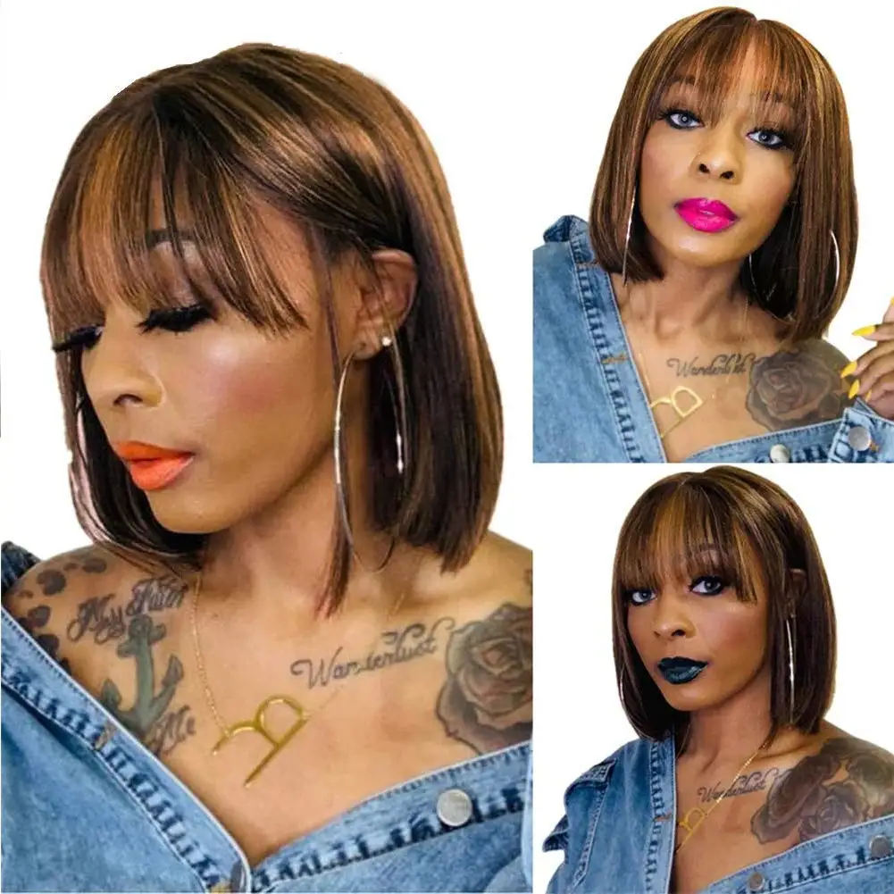 Короткие человеческие волосы прямые боб с челкой парики без шнуровки полностью машинное изготовление для черных женщин ALEESA remy бразильские