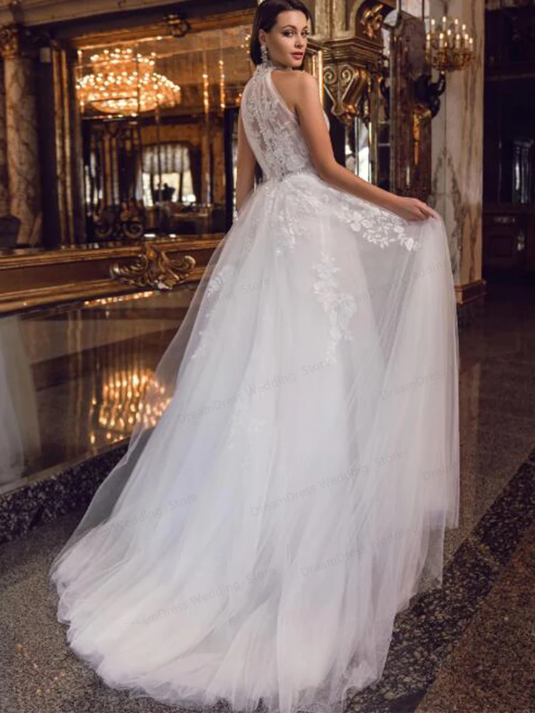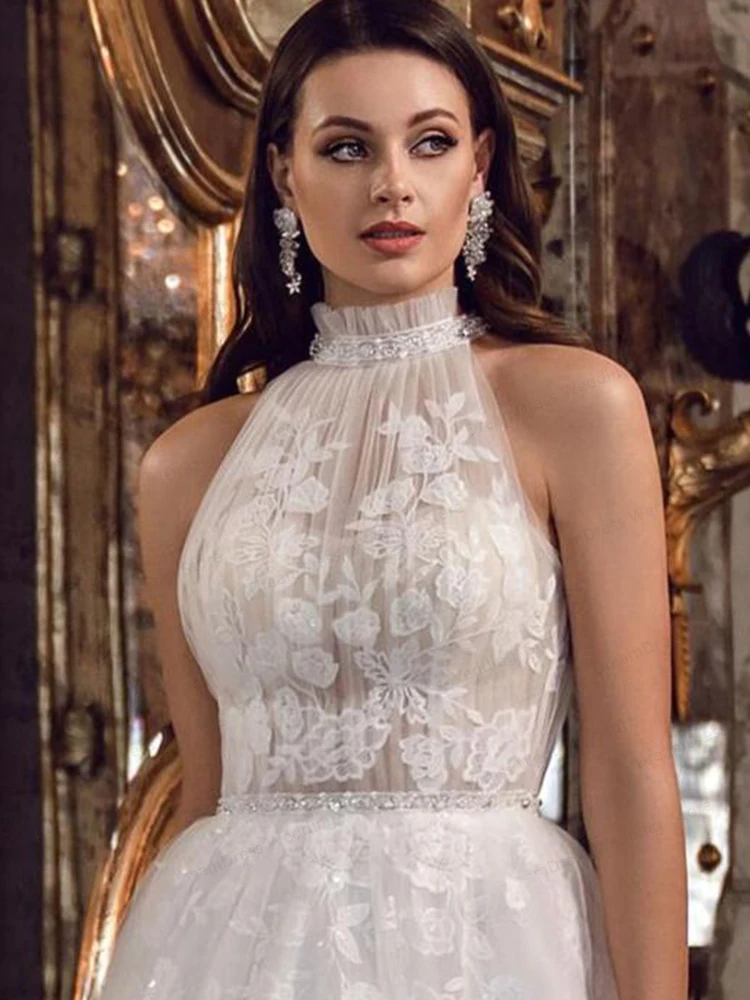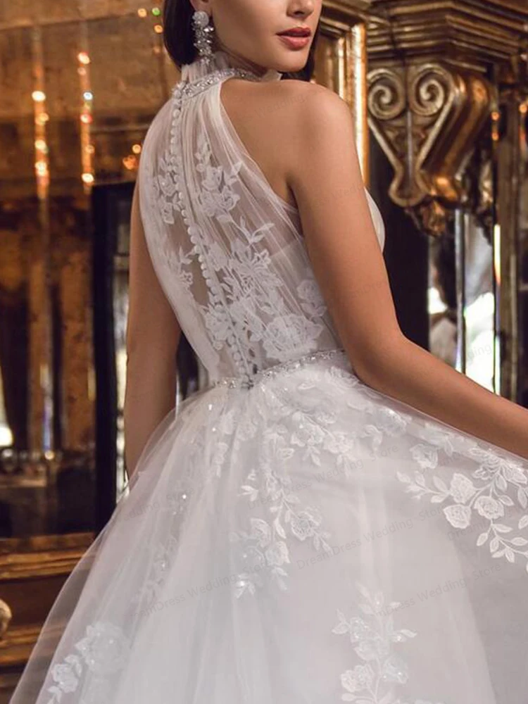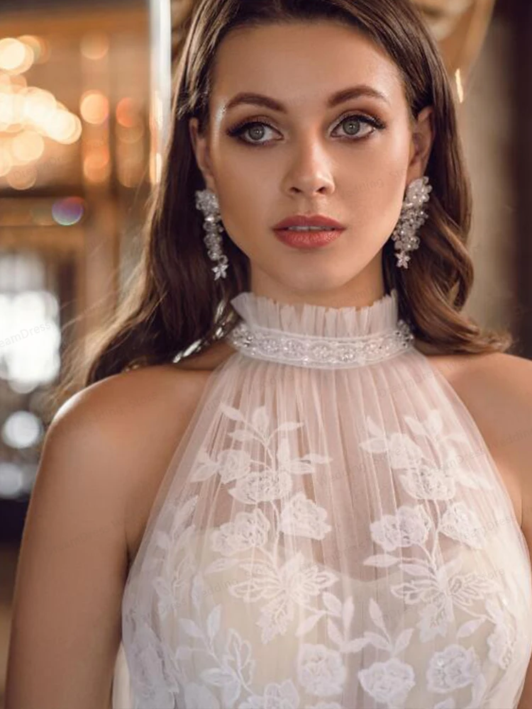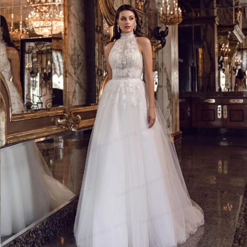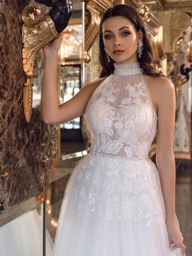 Женское свадебное платье принцессы с высоким воротником, элегантное кружевное платье без рукавов с аппликацией, свадебное платье А-силуэта, индивидуальный пошив, гражданский стиль, деревенский стиль