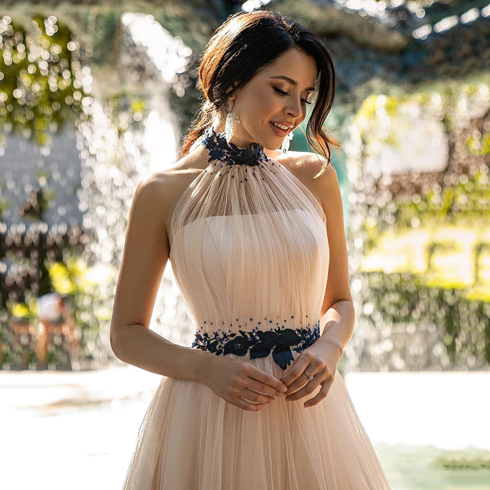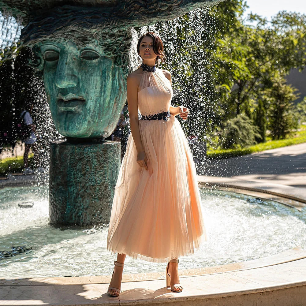 UZN элегантное вечернее платье А-силуэта длиной ниже колена с бретелькой на шее без рукавов с кружевной аппликацией для выпускного вечера с молнией и бисером