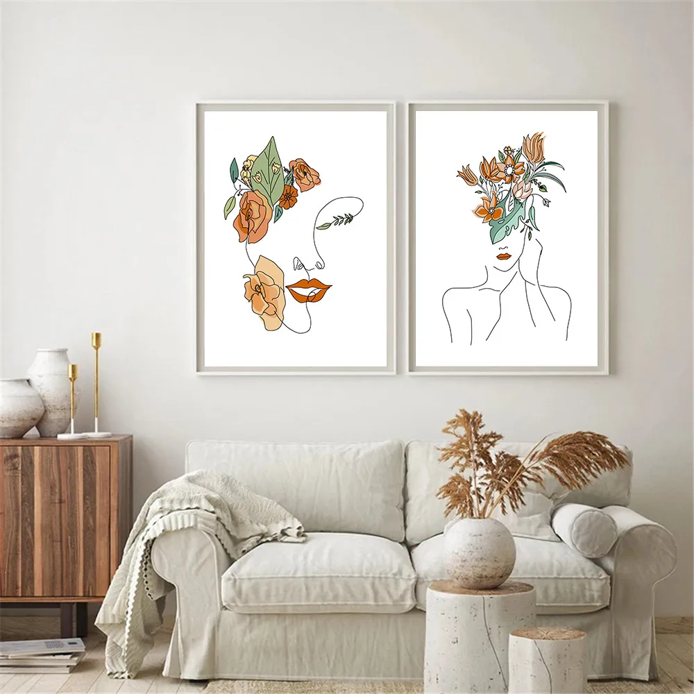 Современная Абстрактная фигурка, линия, Художественная печать, женщина, губы, лицо, холст, живопись, цветные цветы, листья, плакат, настенные картины в скандинавском стиле, домашний декор