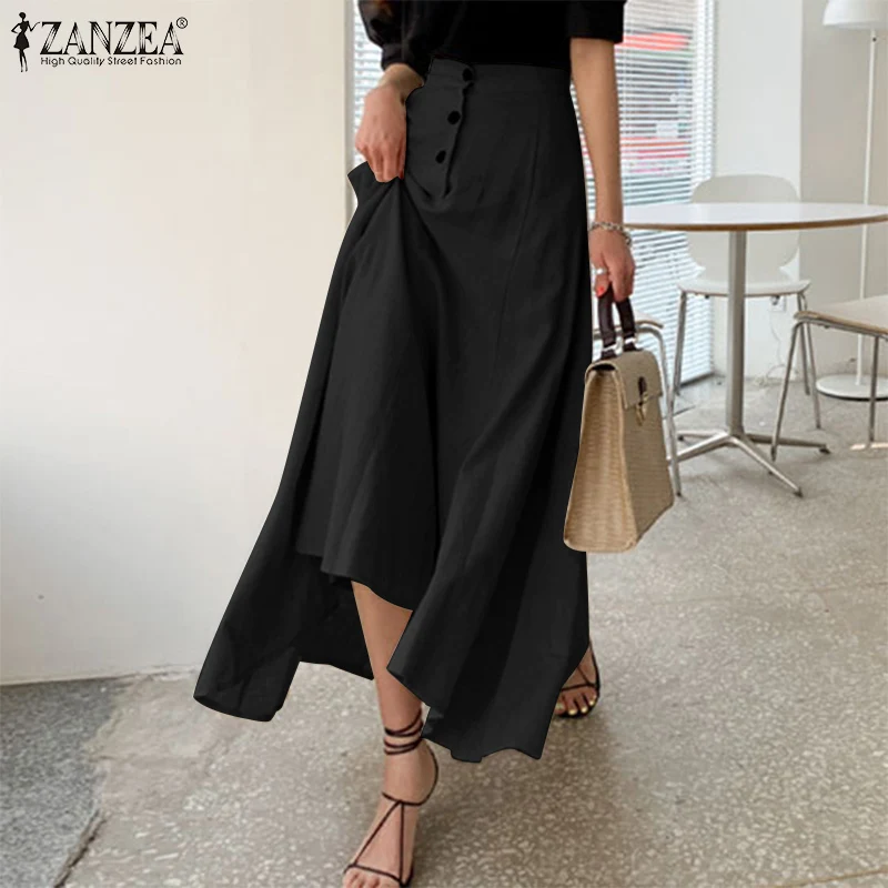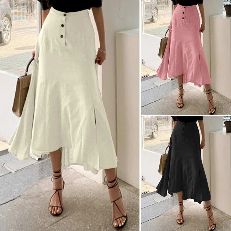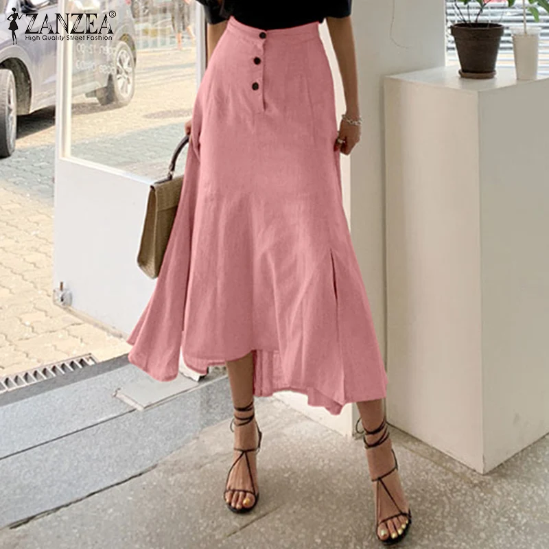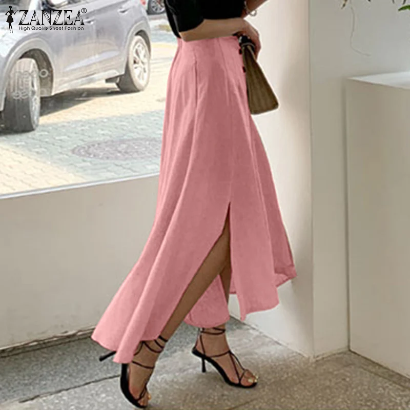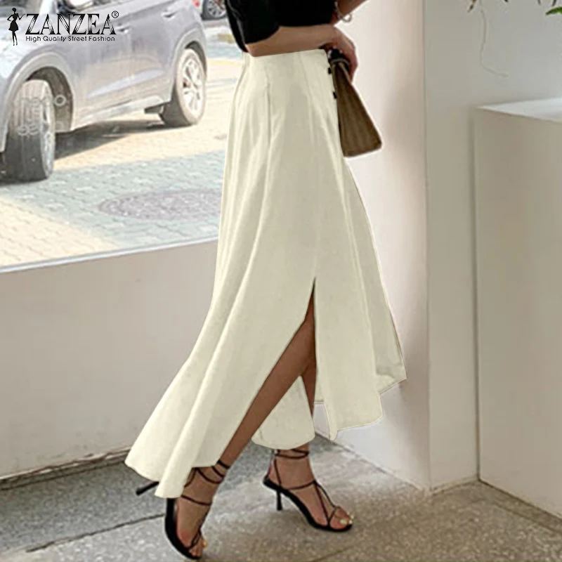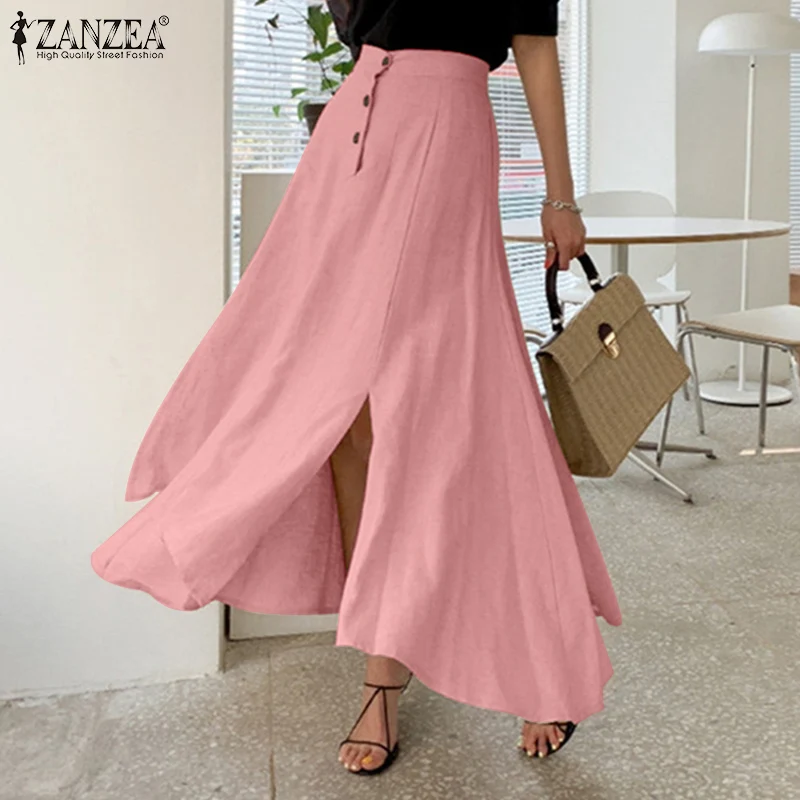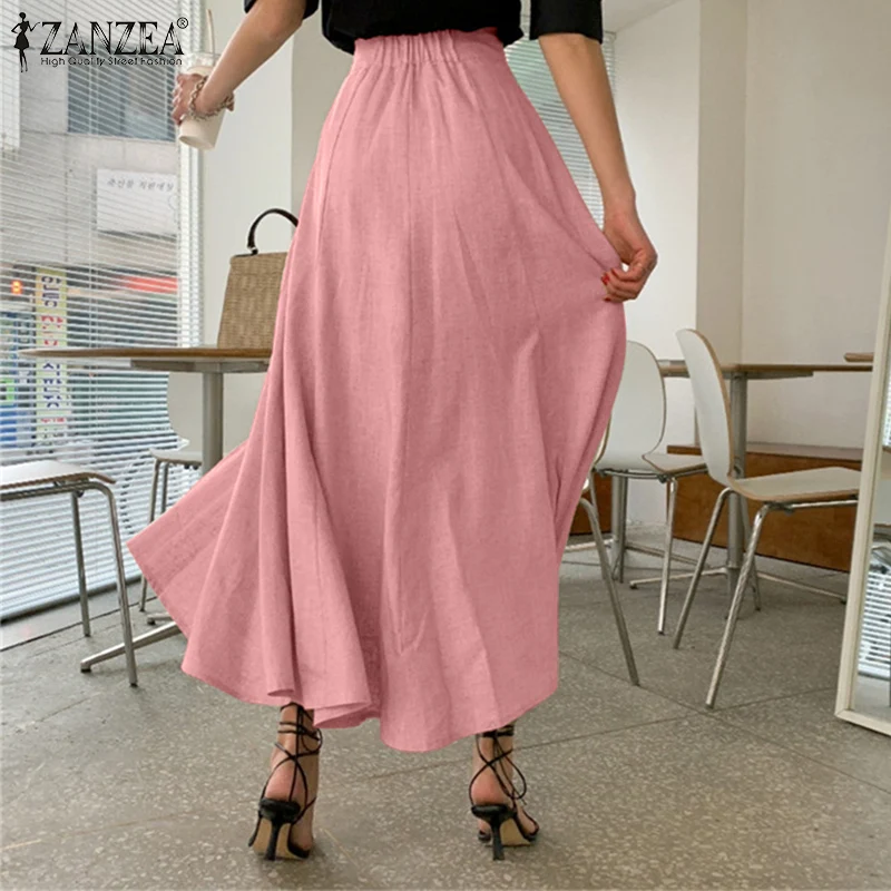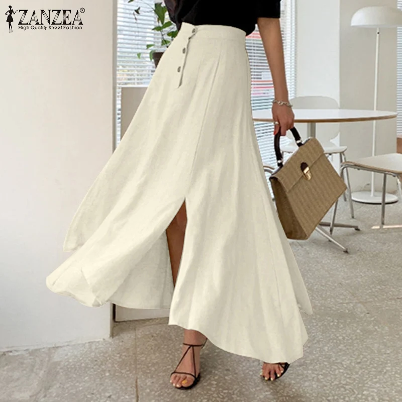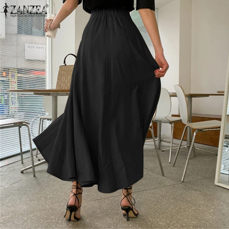 Юбка ZANZEA Женская длинная однотонная, праздничная Повседневная элегантная хлопковая юбка-трапеция в стиле оверсайз с завышенной талией и разрезом, 2021