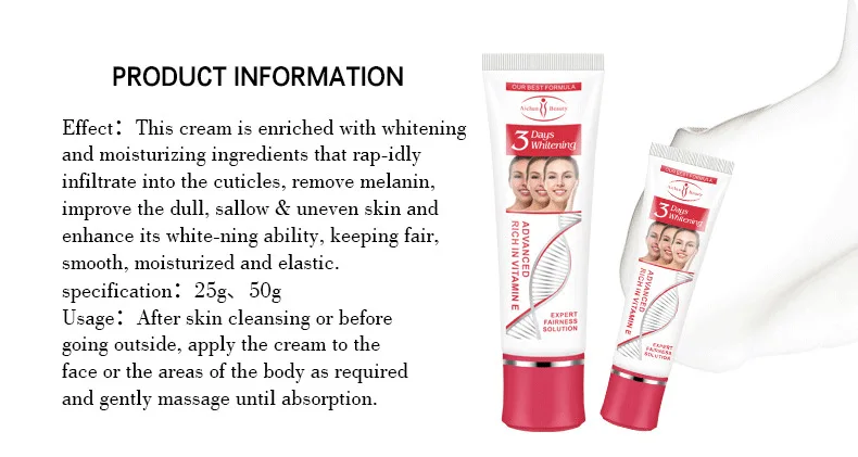 ★3 дня отбеливание экспертное решение справедливости▶Эффект: Этот Крем обогащен отбеливающими и увлажняющими ингредиентами, которые быстро проникают в кутикулу, на для удаления меланина, улучшают тусклую, солёную и неровную кожу и повышают ее отбеливающую способность, сохраняя светлую, гладкую, увлажненный и эластичный.▶Спецификация: 25 г▶Применение: после очищения кожи или перед выходом на улицу нанесите крем на лицо или области тела по требованию и Аккуратно помассируйте до впитывания.