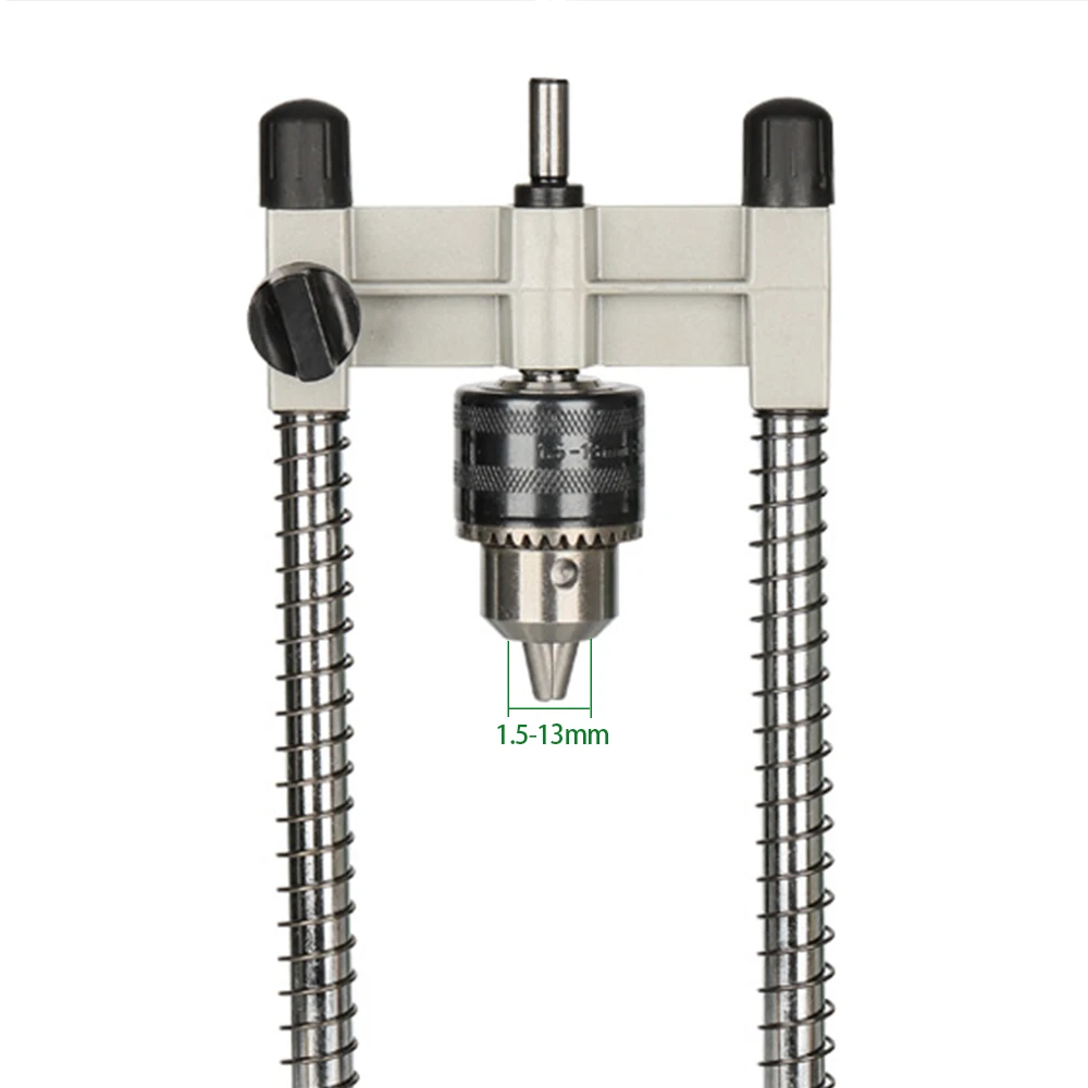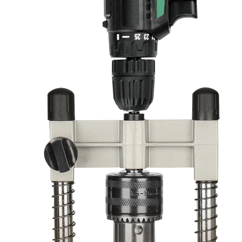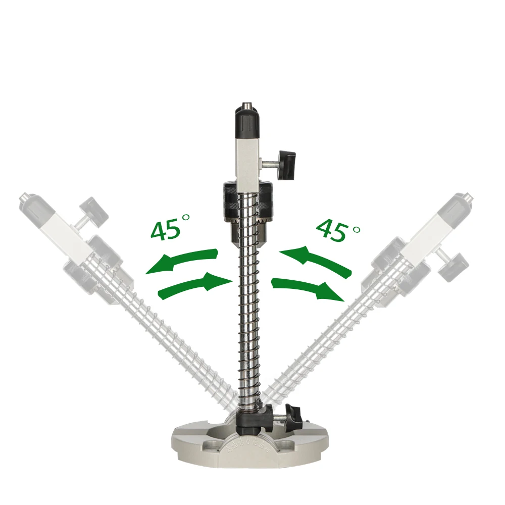 Особенности:1. Прочный и долговечныйОснование изготовлено из высококачественного алюминиевого сплава, а Стойка изготовлена из стали, основная структура прочная и долговечная.2. Регулируемый уголДанное сверло может использоваться в горизонтальном, вертикальном или угловом положении.3. Съемная ручкаДополнительная ручка для точного размещения и против скольжения при сверлении.4. Широкое использованиеЭто идеальный аксессуар для вашей электрической дрели, для точного сверления и распиловки отверстий под заданными углами в любой ситуации-на стене, потолке, на косяках, на круглых заготовках, зубцы и фигурные секции.5. Подходит для 99% сверлаШестигранный хвостовик 8 мм подходит для большинства электрических сверл, силовых сверл, легко устанавливается.6. Высокая эффективностьСами направляющие имеют пружины для быстрого возврата при повторном сверлении.Характеристики:Материал: алюминиевый сплав + стальЦвет: серебристыйРазмер: 14x24 смСверлильный Патрон Диапазон зажима: 1,5-13 ммСверлильный патрон размер хвостовика: 8 ммРегулируемый угол: 45-90 °Максимальный ход: 150 мм