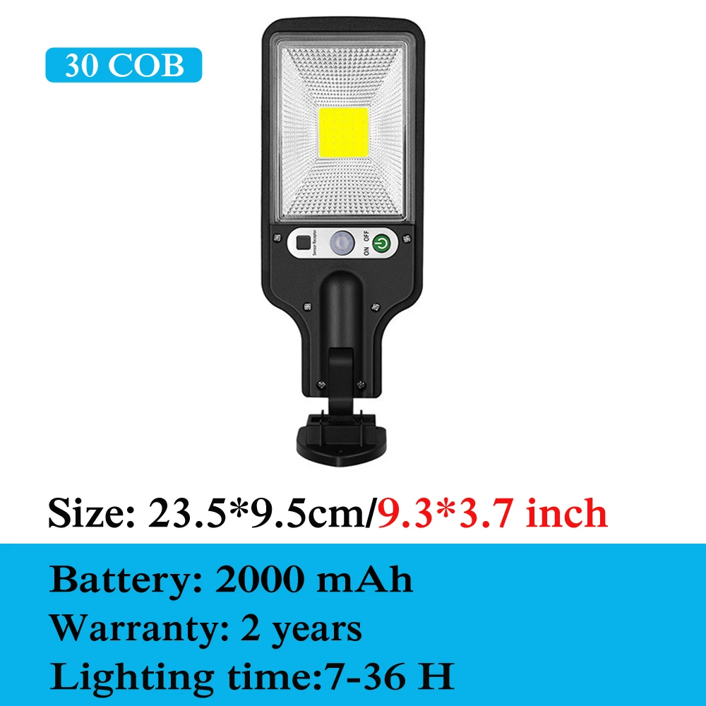 1. Солнечная панель: 6 В 2. Батарея: 3,7 V 2000 mAh ,18650 литиевая батарея 3 светодиодный: светильник 4. Размер: 23*9,5 см. 5. Цвет светодиодов: Белый 6. Способ установки: винты 7. Режим работы: 3 различных режима освещения 8. Материал: ABS + PC пластик 9. Время работы: может работать более 5-24 часов 10. Переключатель: пульт дистанционного управления 11. Водонепроницаемость: IP65