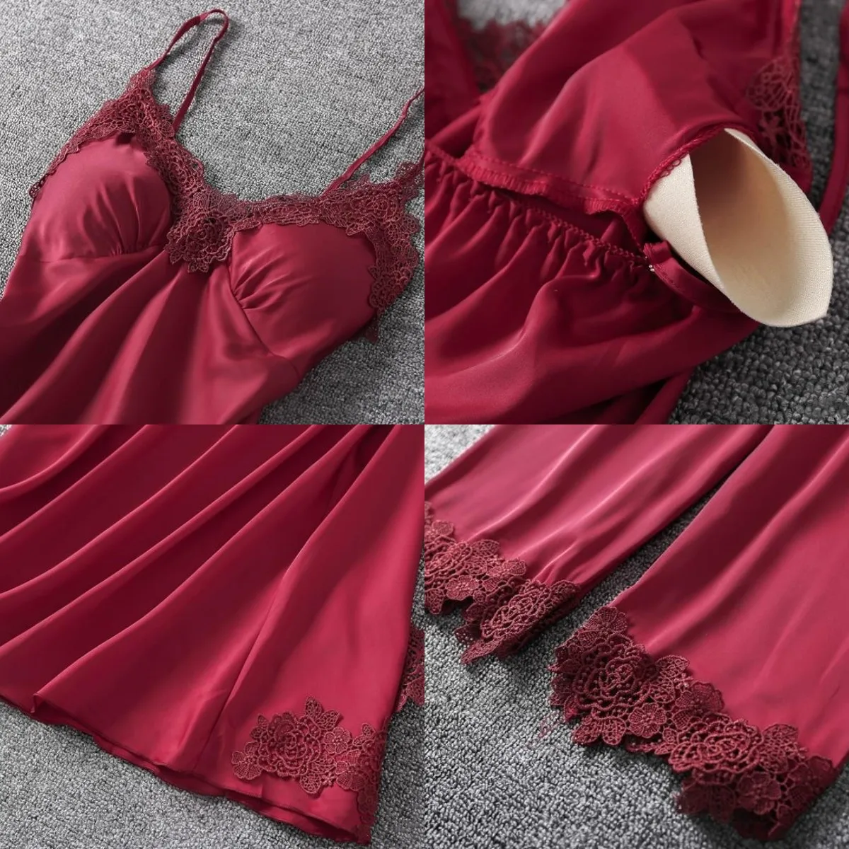 Daeyard Сатиновые пижамы наборы для женщин, 5 шт.набор, сексуальное кружевное платье на бретелях Топ и штаны ансамбль; Одежда для сна; Демисезонный Домашняя одежда ночной халат платье набор