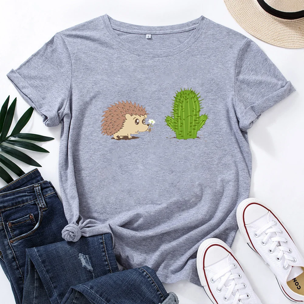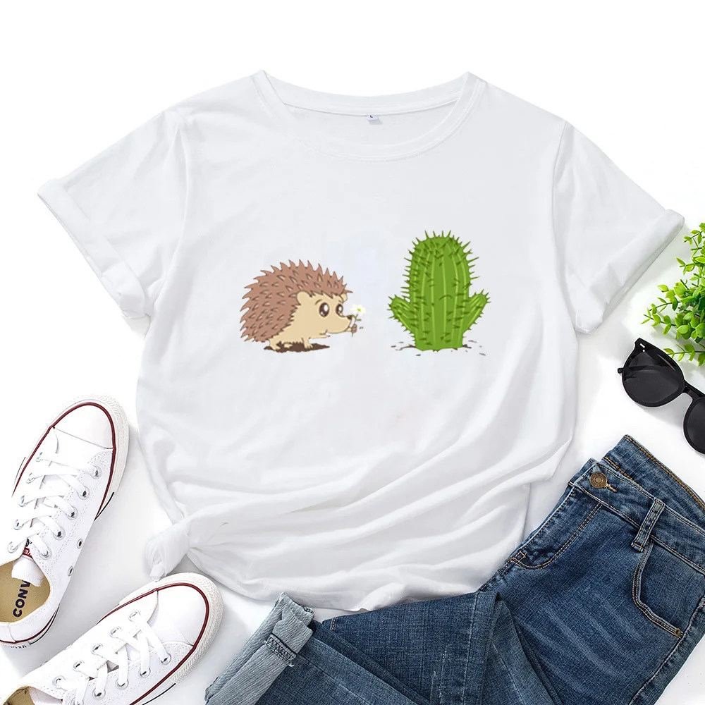Футболка женская хлопковая с круглым вырезом, ежик и кактус, модная смешная рубашка в стиле Харадзюку, с животными и растениями, свободная