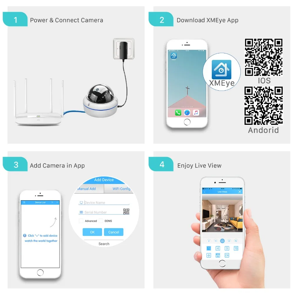 1. Загрузите приложение «XMEye» из Google Store или App Store2. Поиск устройства непосредственно под локальной сетью (убедитесь, что камера подключена к маршрутизатору и источнику питания).