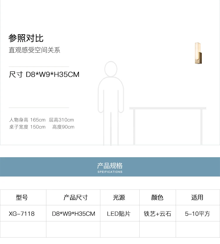 Размер: L9 X H35 смМатериал: железо, мраморЦвет: как на картинкеСветильник источник света: светодиодныйПроцесс: Краска матовая, покрытие, полировка, сварка, горячий изгибСтиль: Современный