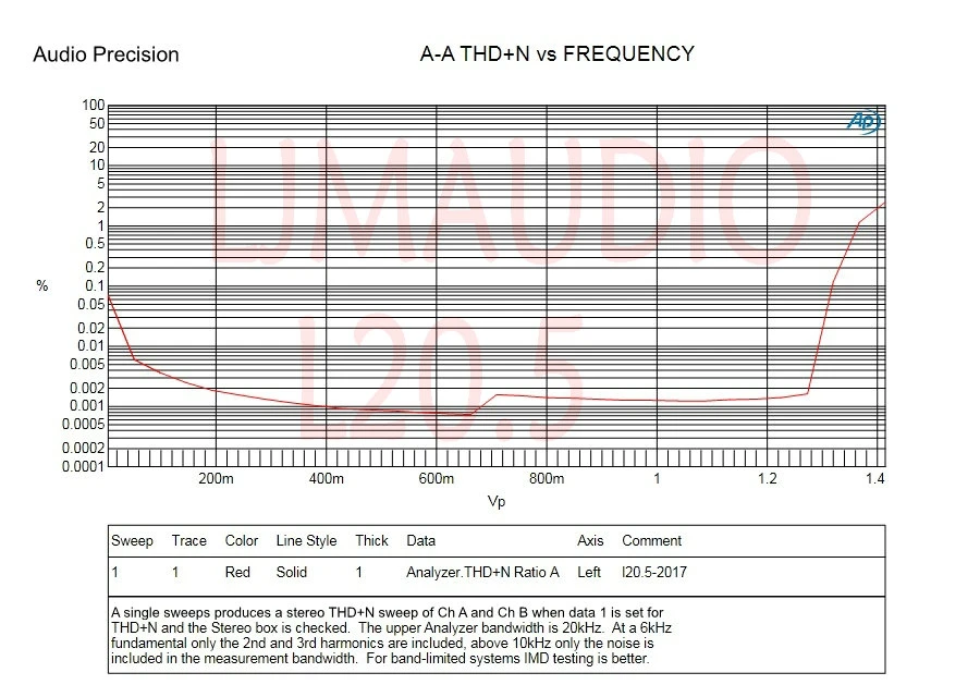Карта искажений THD + N THD + N = 0,001-0.002% 20 Гц-20 кГц выходная мощность 10 Вт нагрузка 8 Ом THD + N = 0.001% A вес