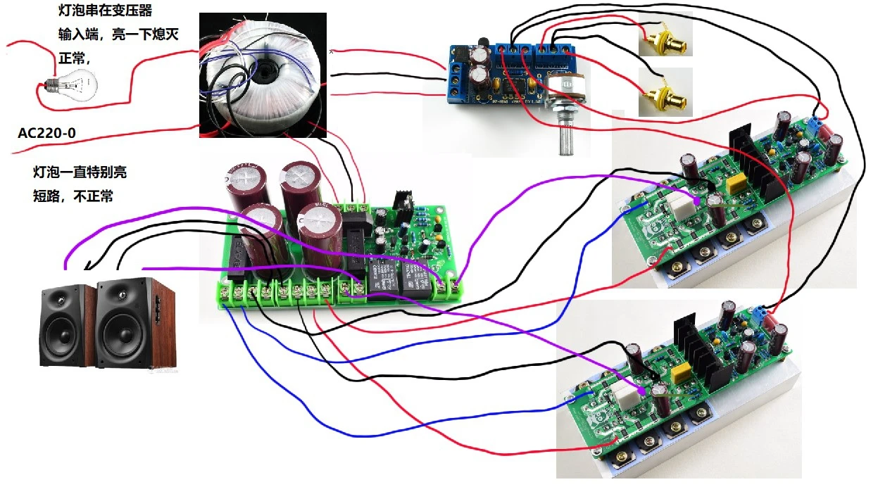 Коэффициент демпфирования> 400, нагрузка 8 Ом. Отношение S/N> 98дБ. Входная чувствительность: 2 В RMS 200 Вт 8R источник питания Идентификация подключения к установке: VCC + положительный источник питания, VEE-отрицательный источник питания, PGND power ground. Вход + входной сигнал +, входной сигнал- Выход + выходной сигнал +, отрицательный полюс динамика соединен с положением GND платы питания. Для тестирования рекомендуется подключить лампу к первичному трансформатору 220 В. Снимите лампу и используйте ее в нормальных условиях.