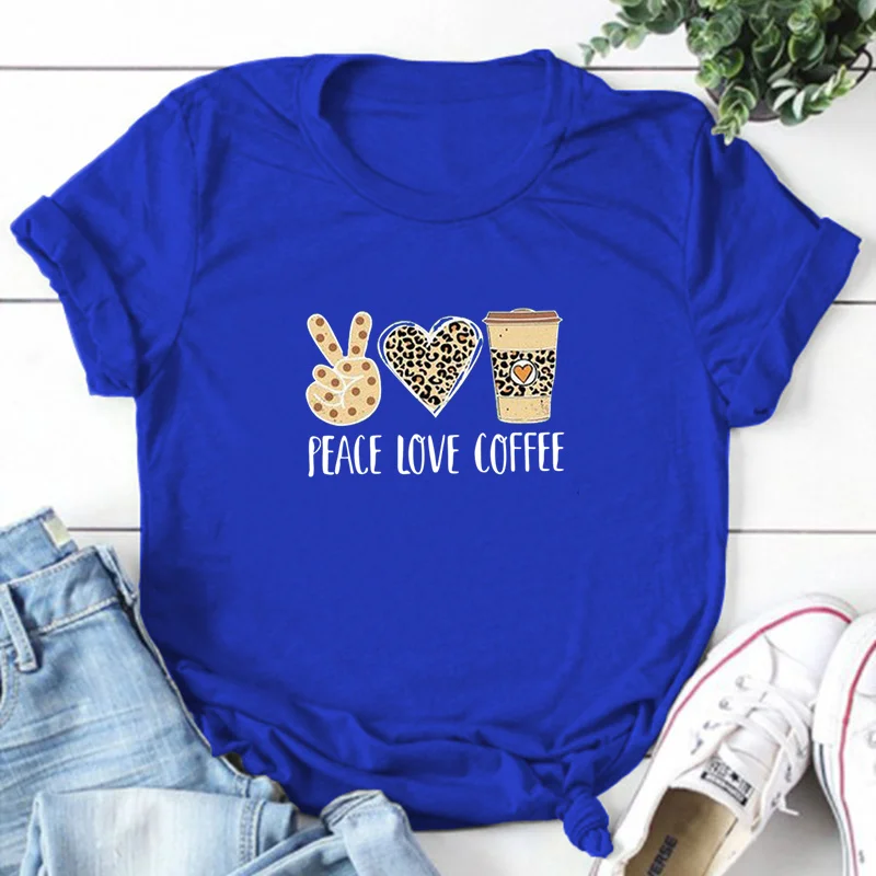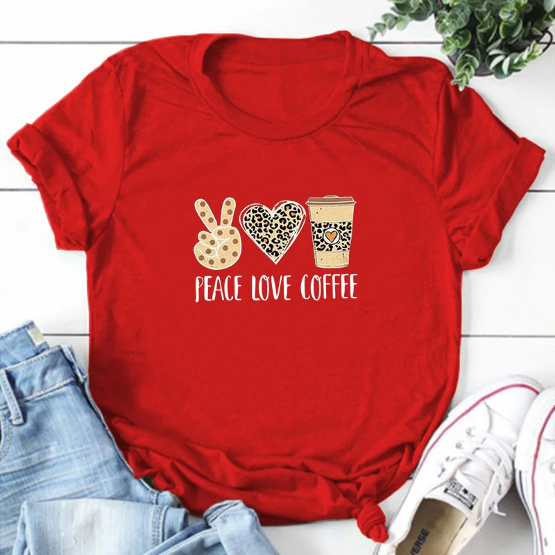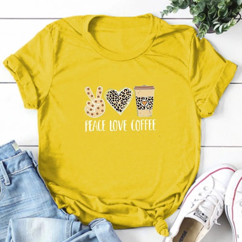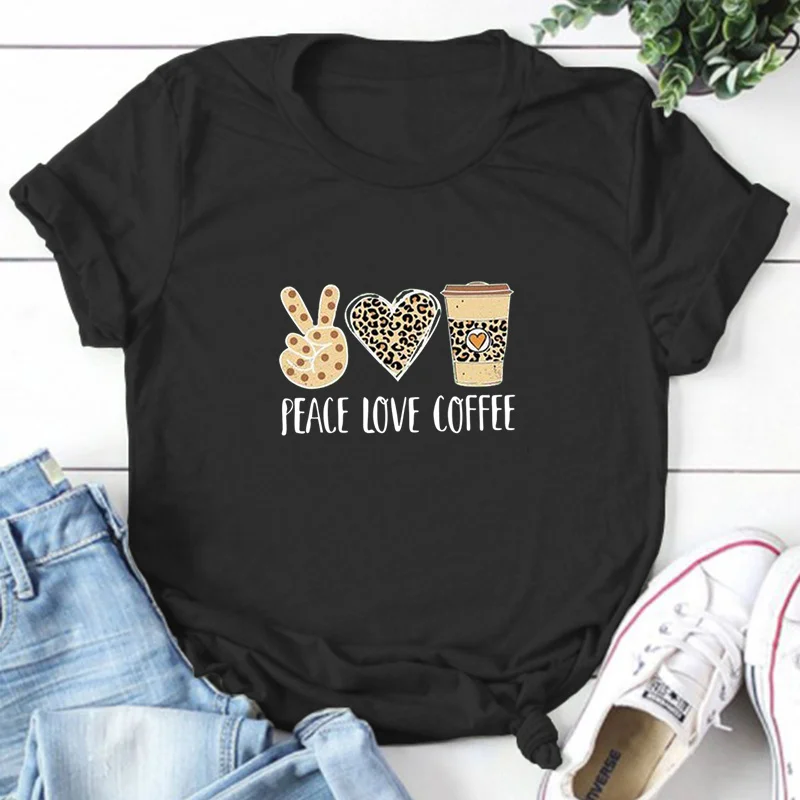 Модные женские Топы 2021, футболка с леопардовым принтом «Мир, любовь, кофе», Повседневная футболка с круглым вырезом, летние женские футболки, женские футболки