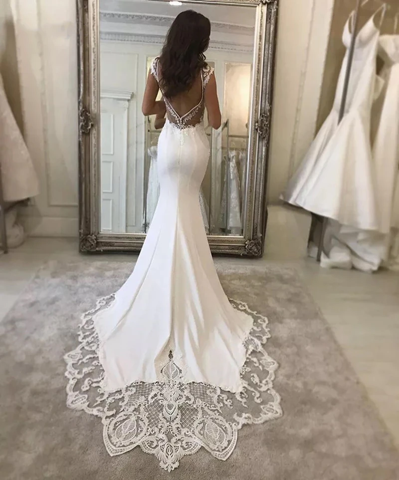 Очаровательное свадебное платье русалки с глубоким V-образным вырезом 2021 с коротким рукавом Кружева Аппликации с открытой спиной Формальное атласное платье невесты с длинным рукавом