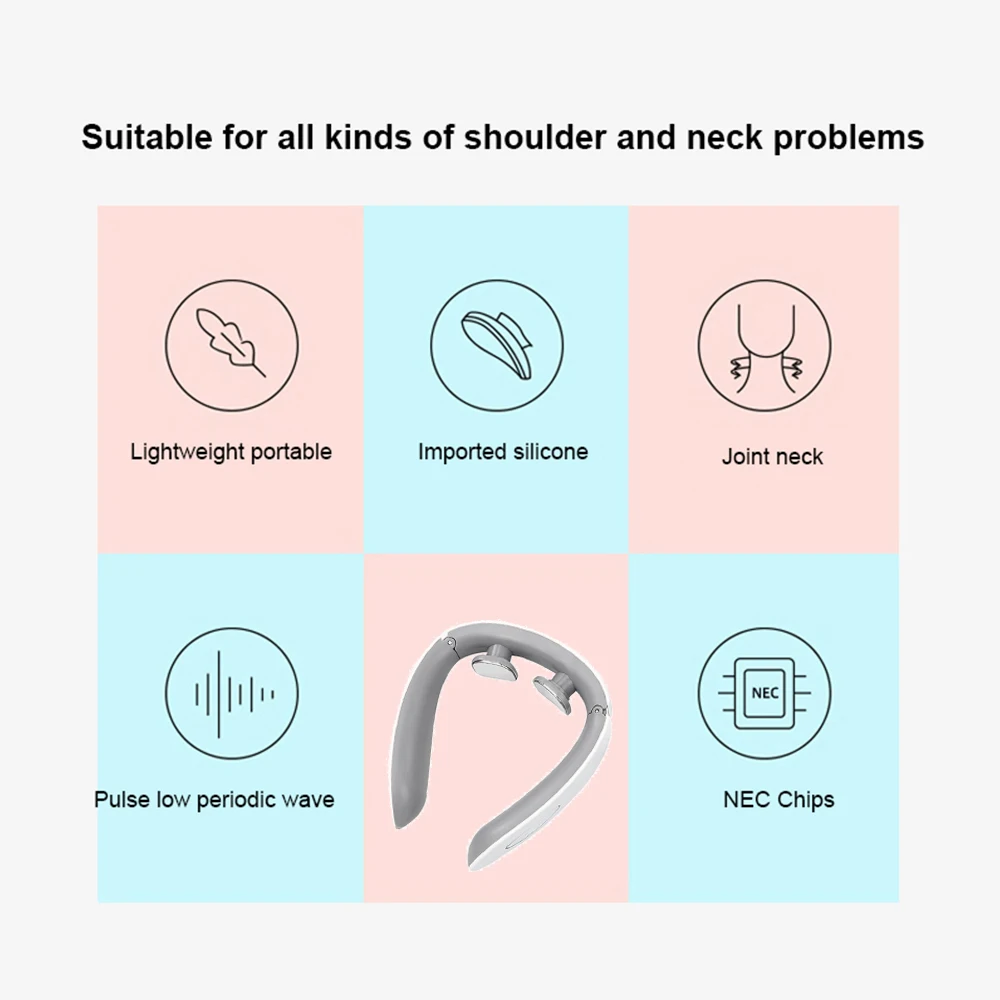 *Напоминание: Протрите шею влажным полотенцем перед использованием, чтобы массажер был близок к коже, чтобы не вызвать покалывание; Электрический пульс слабый, а затем сильный, так что шея может адаптироваться к электрическому импульсному массажу, И постепенно Подстраивайте его под силу, которая вам подходит, каждый имеет различную чувствительность к электрическому импульсу. Если вы чувствуете себя плохо, вы можете выбрать другие функции для массажа.