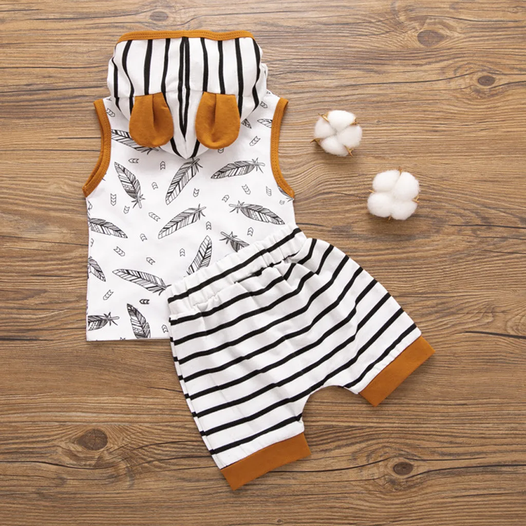 2021 Новая модная детская одежда, 2 шт. пляжные шорты, топы, комплекты одежды для новорожденных, для маленьких мальчиков и девочек с капюшоном футболка с перьями топы и шорты в полоску; Комплект одежды со штанами одежда тела beb