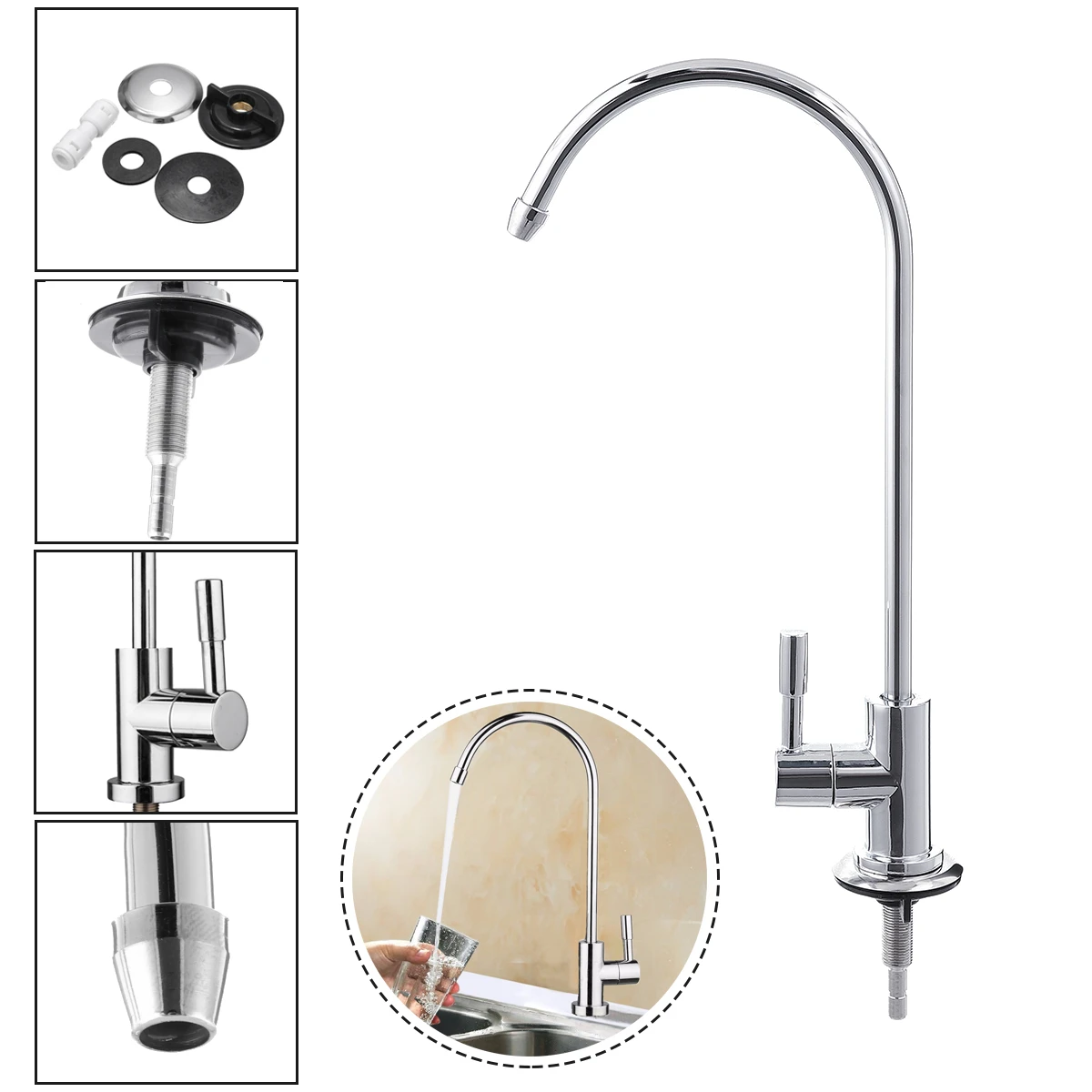 Особенности:1. Модель: WR352. Материал: нержавеющая сталь 304, сплав, медный сердечник3. Кран с изящным дизайном дуги, яркая хромированная отделка4. Подходит для всех систем фильтров для воды5. Используется 1/4 "поставка труб, Длинный Носик6. Широко используется в различных видах чистой воды, фильтров для воды, очистителей воды, смягчителей воды, устройство для электролиза водыВращающийся на 7,360 ° дизайн гусиный шейный кран8. Цвет: хром9. Размер: Общая высота: 31 см, длина воротника: 13 см * 21 см Посылка включает в себя:1x 1/4 ''RO фильтр для воды кран1 сумка для аксессуаров