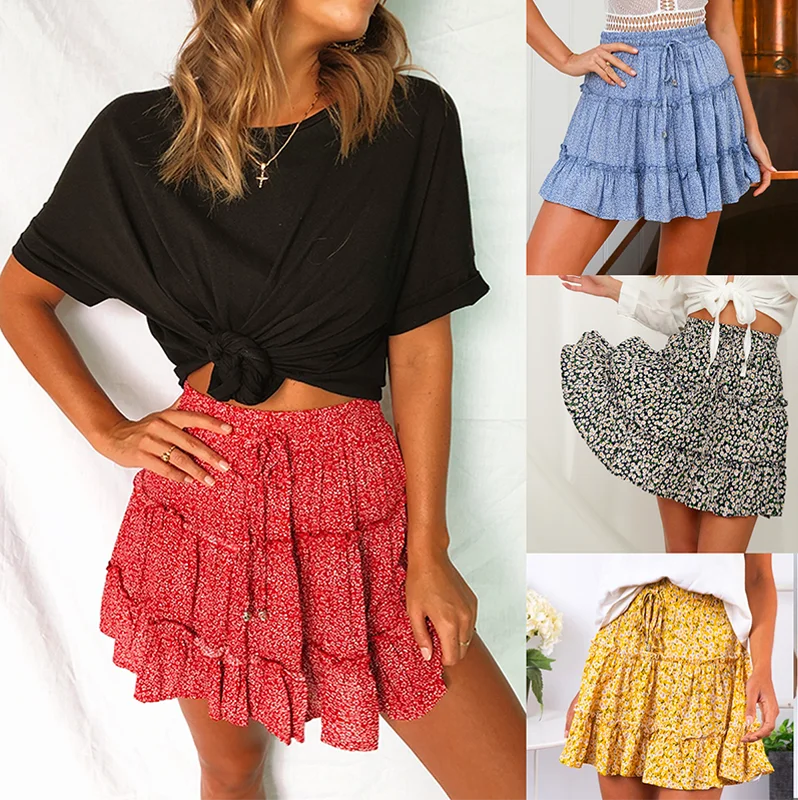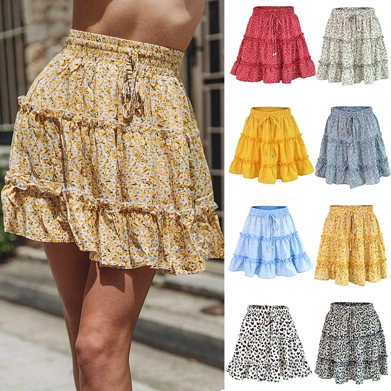 Женская короткая юбка, летняя пляжная розовая трапециевидная юбка с высокой талией и цветочным принтом, 2021