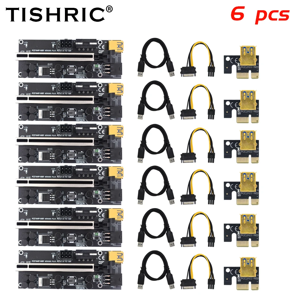 6 шт. TISHRIC 3 в 1 6Pin PCI PCIE Riser 009s Plus VER009s PLUS Riser Card GPU Card Molex USB 3,0 PCI E 16X Riser для майнинга