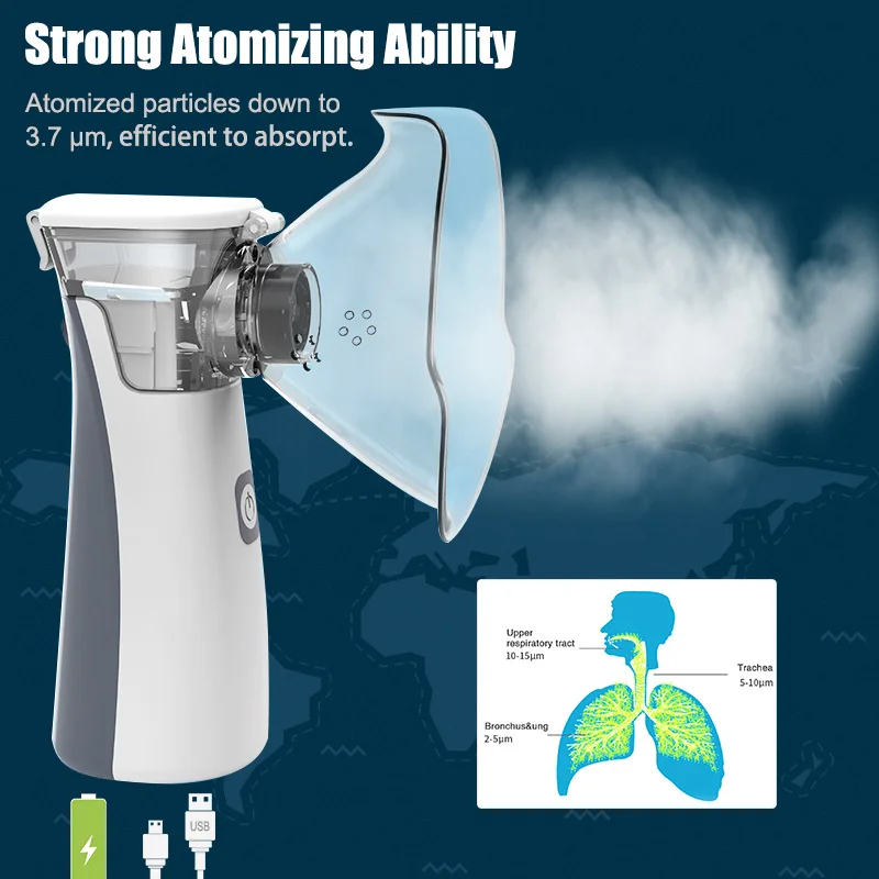 Он в основном используется для лечения различных заболеваний верхних и нижних дыхательных систем, таких как простуда, жар, кашель, астма, боль в горле, фарингит, ринит, бронхит, пневмокониоз и другие трахеи, бронхи, альвеоли и болезни грудной клетки. Небузированная Ингаляционная терапия является важным и эффективным методом лечения респираторных заболеваний. Небузированный ингалятор используется для распыления раствора препарата в крошечные частицы. Препарат поступает в дыхательные пути и легкие через дыхательные ингаляции, тем самым достигая безболезненности в целях быстрого и эффективного лечения, пожалуйста, Управляйте Методом Распыления при медицинской консультации.