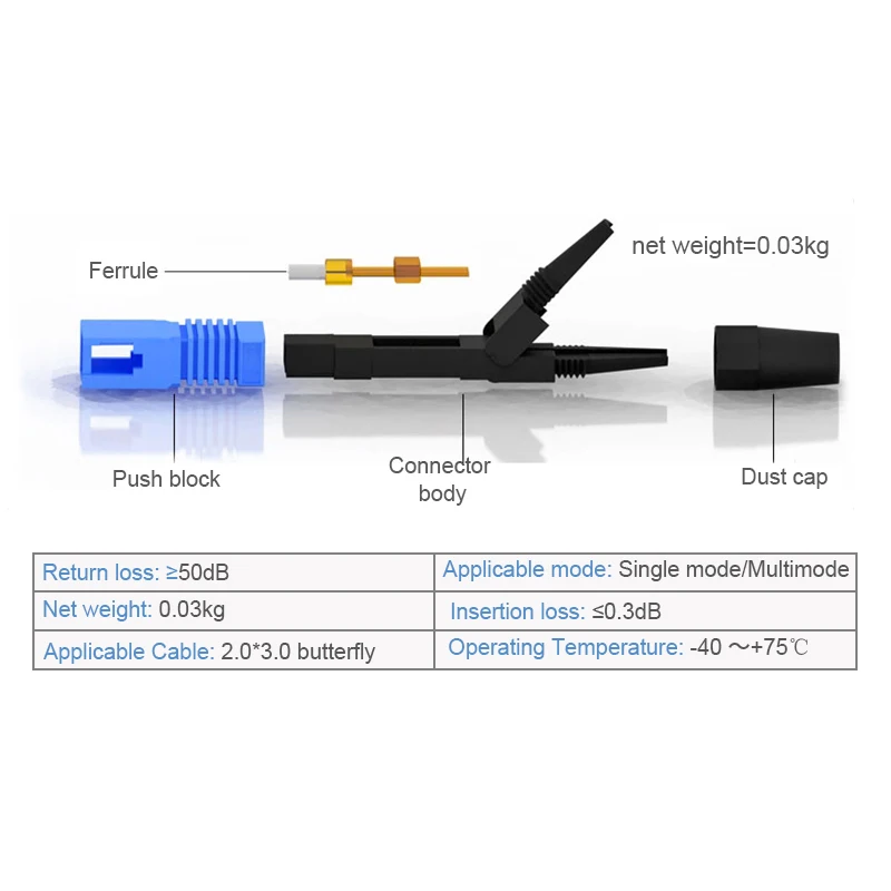 Многоразовый оптический Быстрый разъем SC предназначен для полевого использования в плоских (с низким коэффициентом трения) кабелях до 3 мм и/или от 2 до 3 мм оптических шнуров в сетях FTTH.
