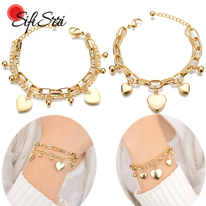 Женские двухслойные браслеты в форме сердца Sifisrri, регулируемые цепочки из нержавеющей стали, подарочные украшения