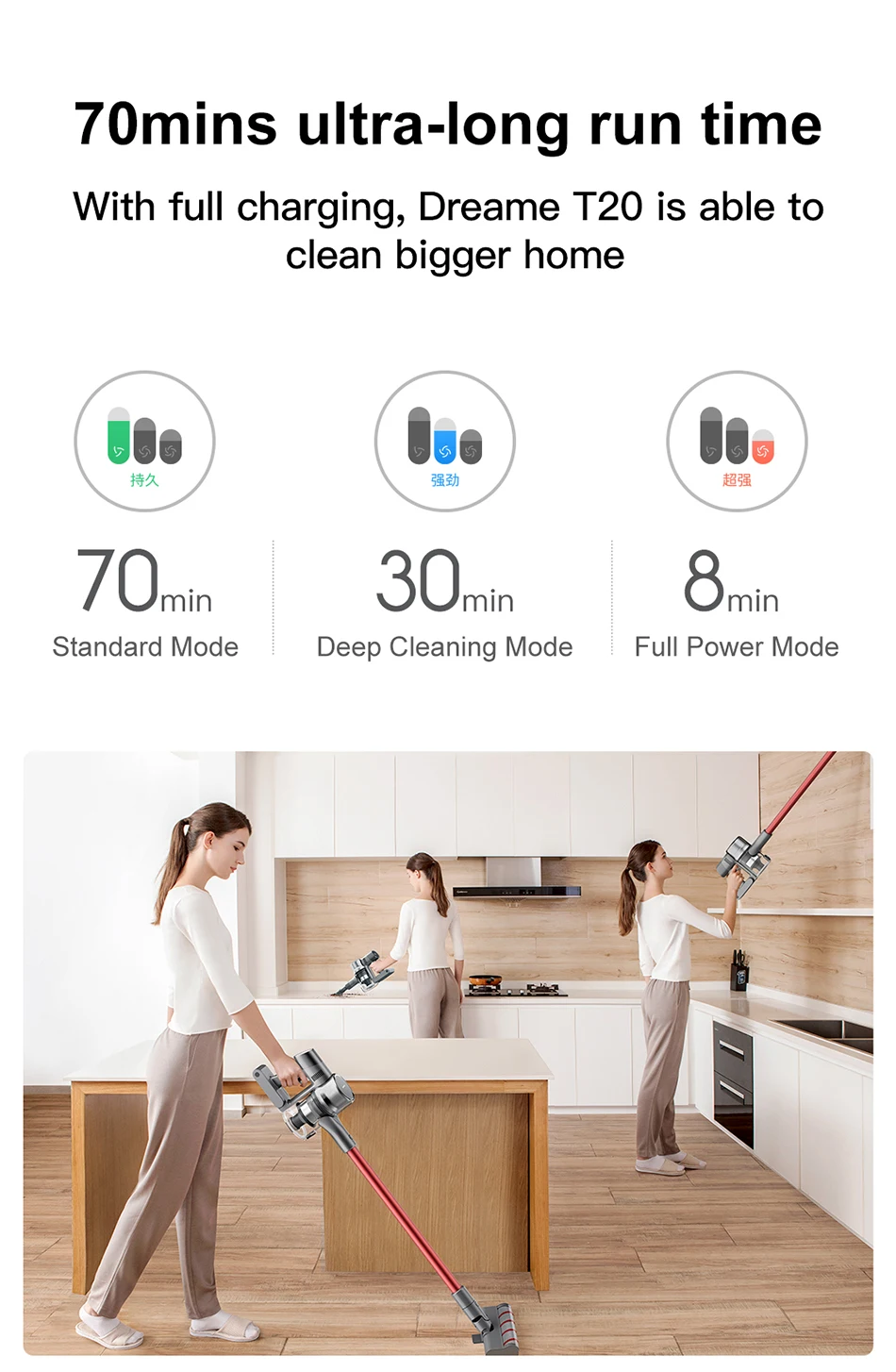 Сверхдлительное время работы 70 минутС полной зарядкой Dreame T20 сможет убрать больший дом