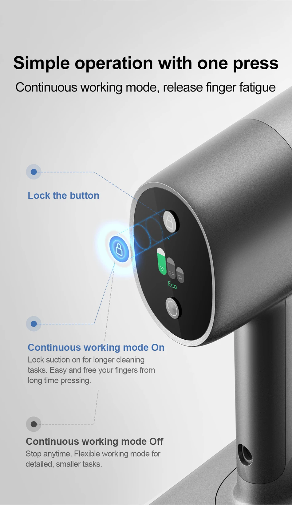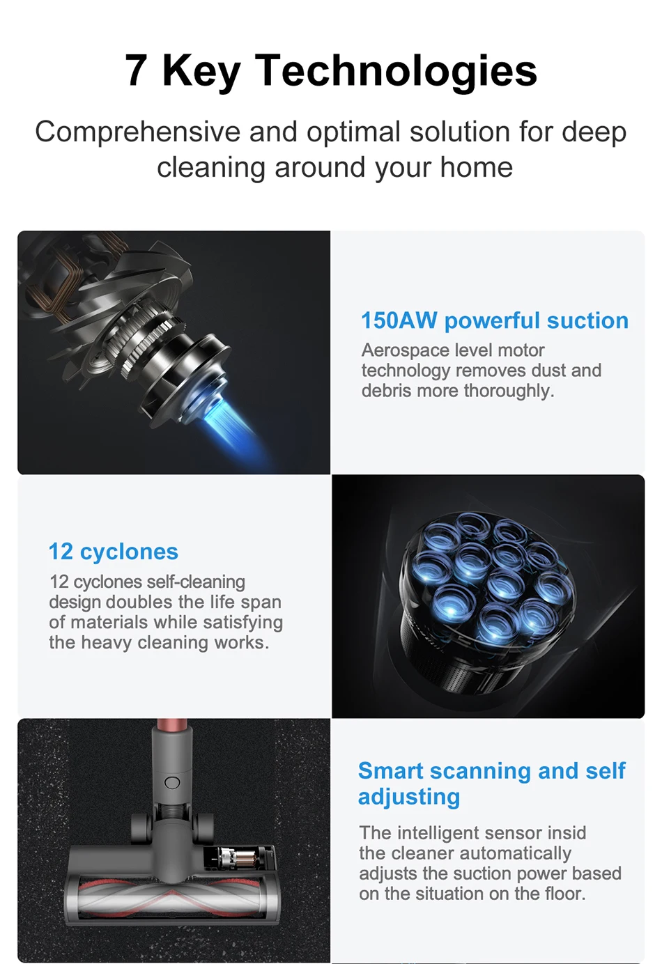* 25000 Вт Мощный, ПА, всасывание быстро и легко очищает даже Неприкасаемые места.* 12 циклонов, работающих на 99.97% эффективности фильтрации пыли.* V-образная щетка для всех поверхностей, просто используйте эту V-образную головку щетки для глубокой очистки всех типов полов.* Сменная батарея, со сменными батареями вы получите удвоенное время работы, более 2 часов * непрерывного использования.* Конструкция без пальцев, электронный триггер блокировки обеспечивает непрерывный или непрерывный режим в соответствии с вашими потребностями.* Полноцветный HD-экран, полноцветный HD-экран обеспечивает рабочее состояние в реальном времени.* 8-ступенчатое шумоподавление, 8 тщательно продуманных функций направлены на снижение уровня звука при сохранении эффективности