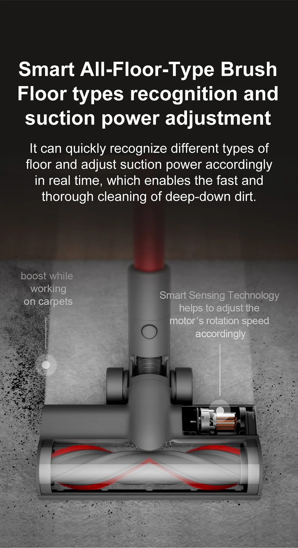 Умная напольная щетка для распознавания пола типа s и регулировки мощности всасыванияОн может быстро распознавать различные типы пола и регулировать мощность всасывания в режиме реального времени, что позволяет быстро и тщательно очистить глубокую грязь