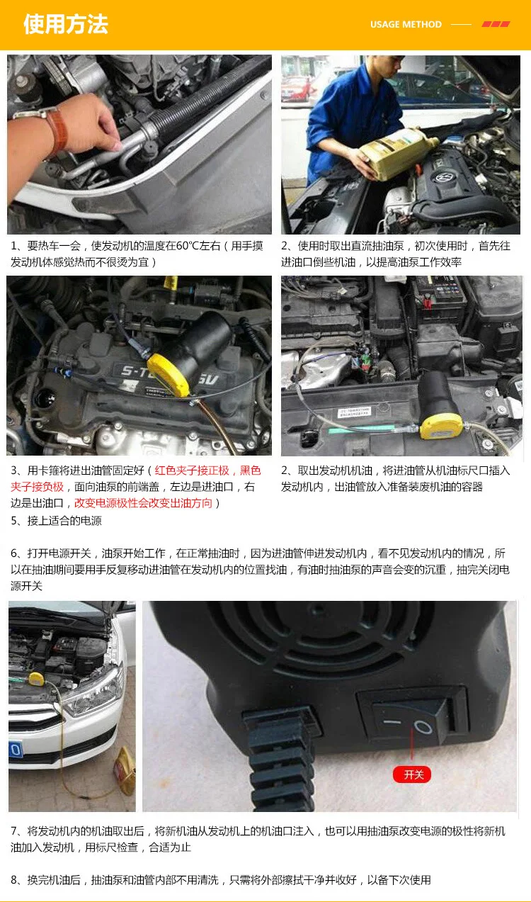 [Эксплуатация]: пистолет для всасывания масла может заставить масло просто вывести двигатель через отверстие масляного щупа. Жидкостный насос работает, подключая зажимы к автомобильному аккумулятору.