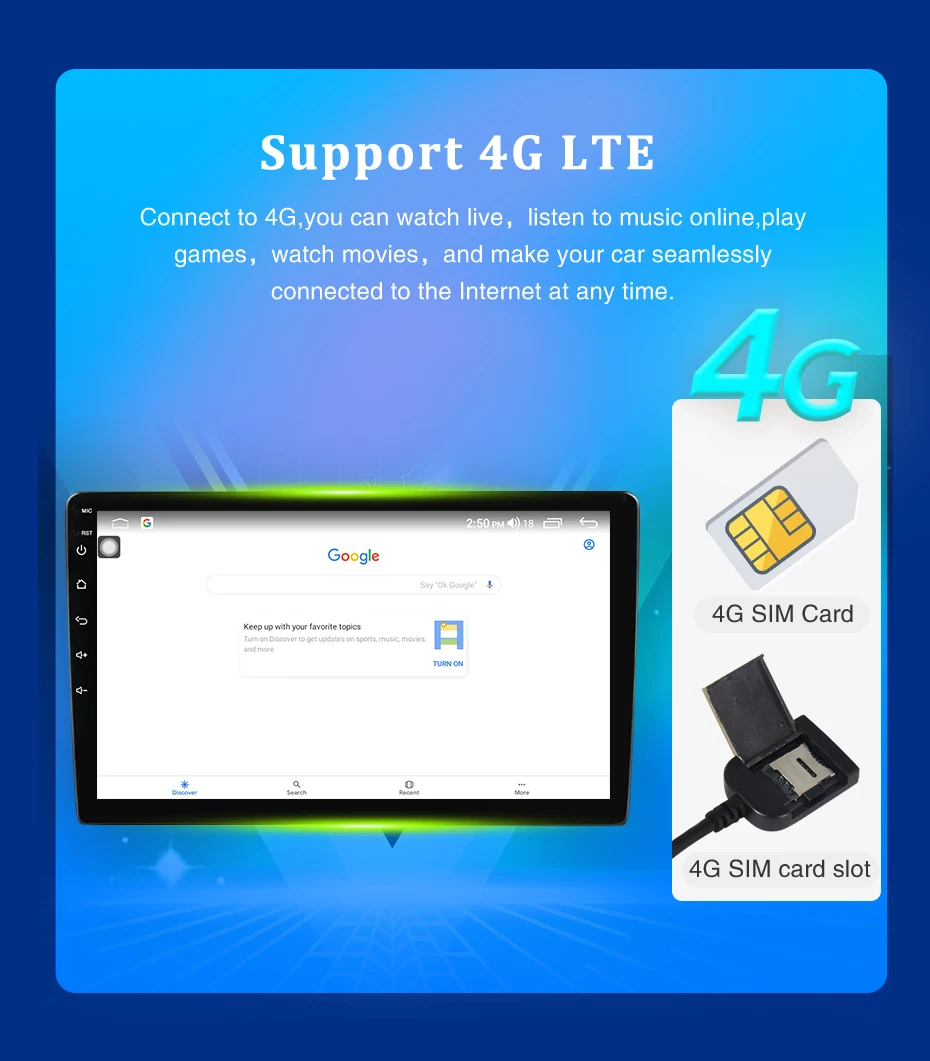 Он поддерживает sim-карту 4G, если сигнал wifi не является хорошим, это делает автомобильное радио подключаться к Интернету в любое время