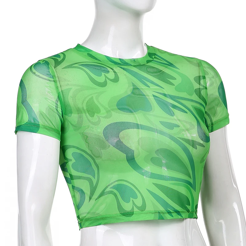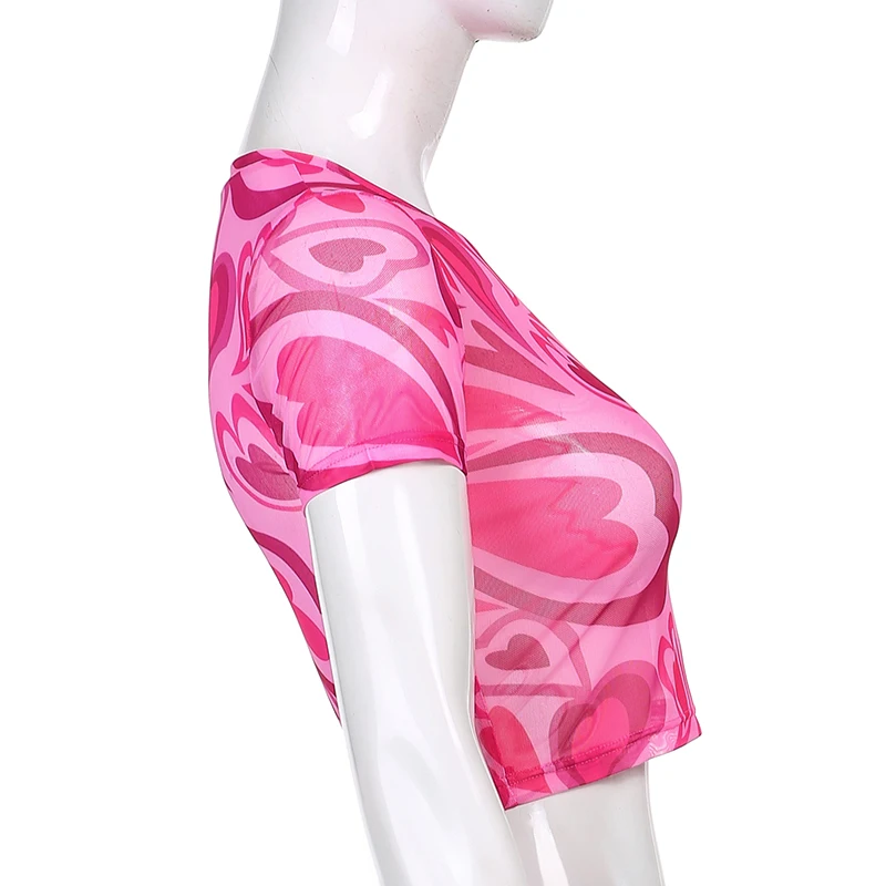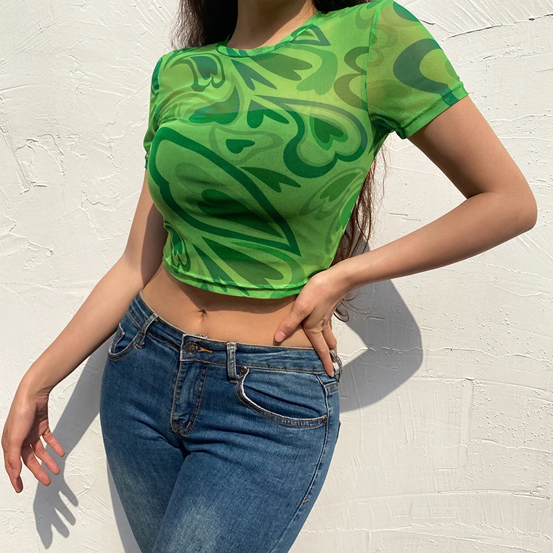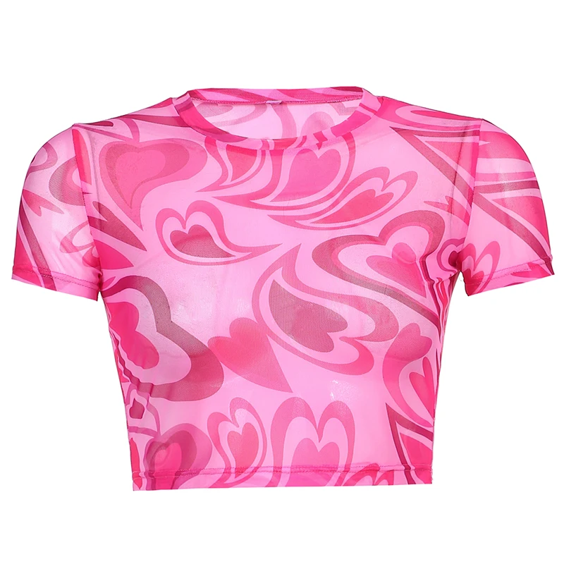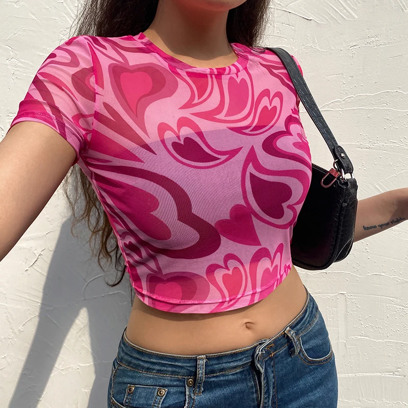 Топ женский сетчатый с принтом в виде сердца, винтажный сетчатый пуловер в стиле Харадзюку, укороченный топ в эстетике y2k, 90s, 2021