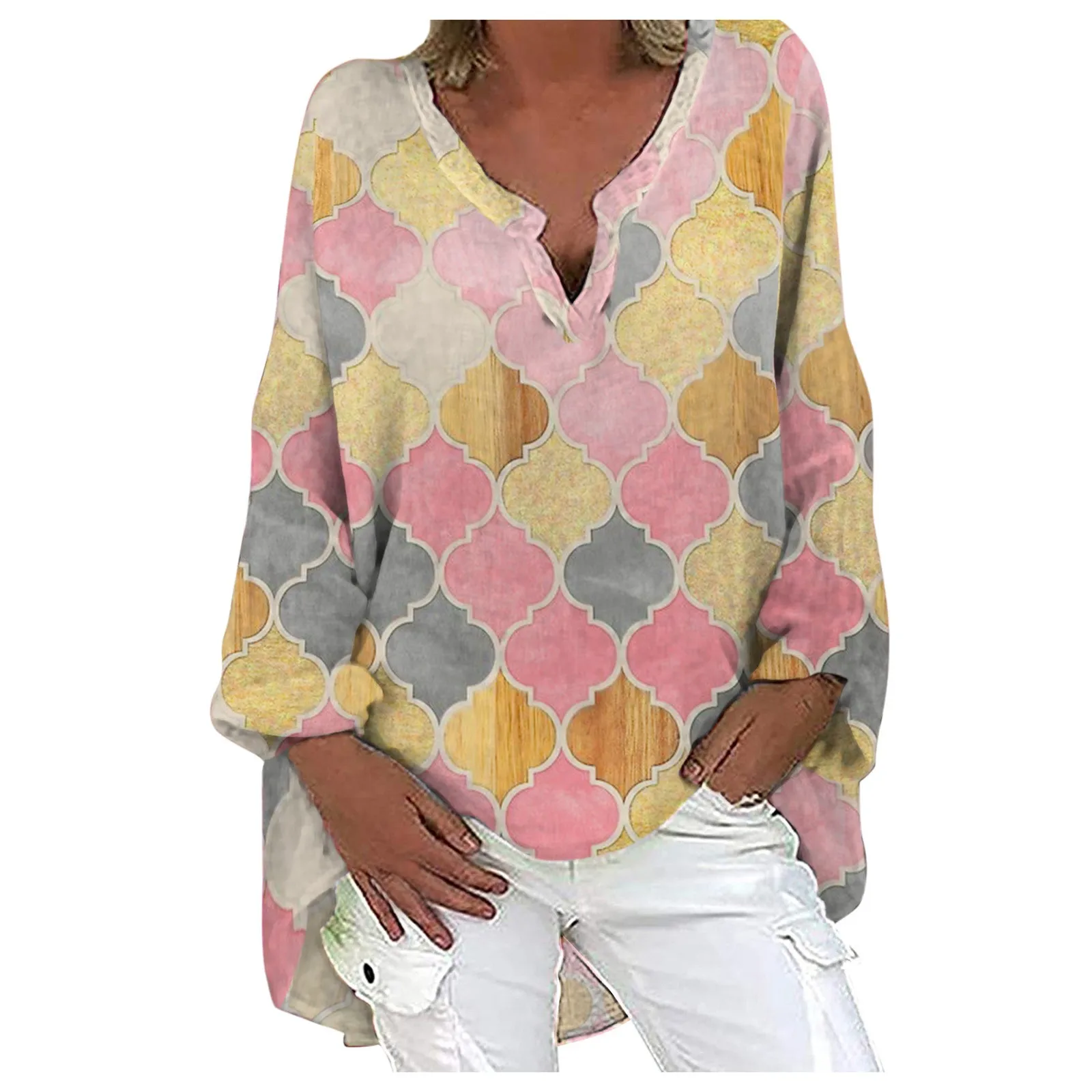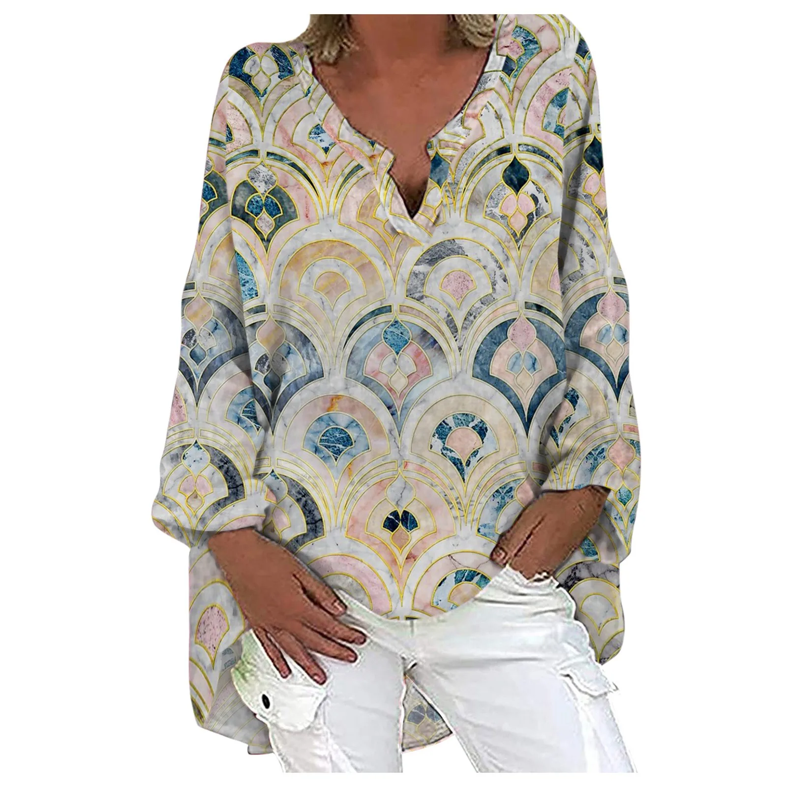 Женская обувь на каждый день с длинным рукавом из хлопка и льна Свободная блузка Весна V образным вырезом печать нерегулярные рубашка Винтажные Солнцезащитные очки Размеры d топы размера плюс Размеры 5 XL
