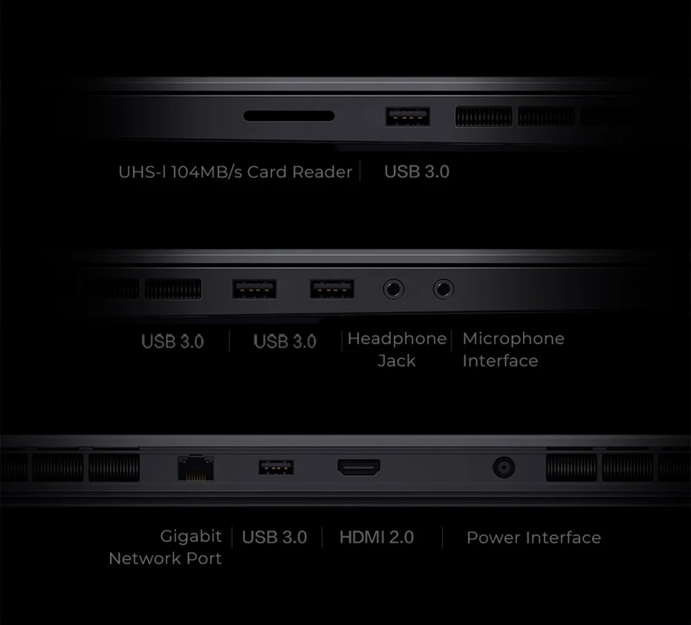 USB3.0 интерфейс x4, 5 ГБ/сек. Максимальная теоретические скорости передачи; Гигабитный сетевой x1, 10/100/1000 Мбит/с3,5 мм разъем для наушников микрофона × 1, 3,5 мм разъем для подключения микрофона × 1 шт.Полноразмерный интерфейс HDM2.0 x1Три-в-одном кард-ридер (UHS-I 104 МБ/с.), поддержка карт памяти SD/SDHC/SDXC