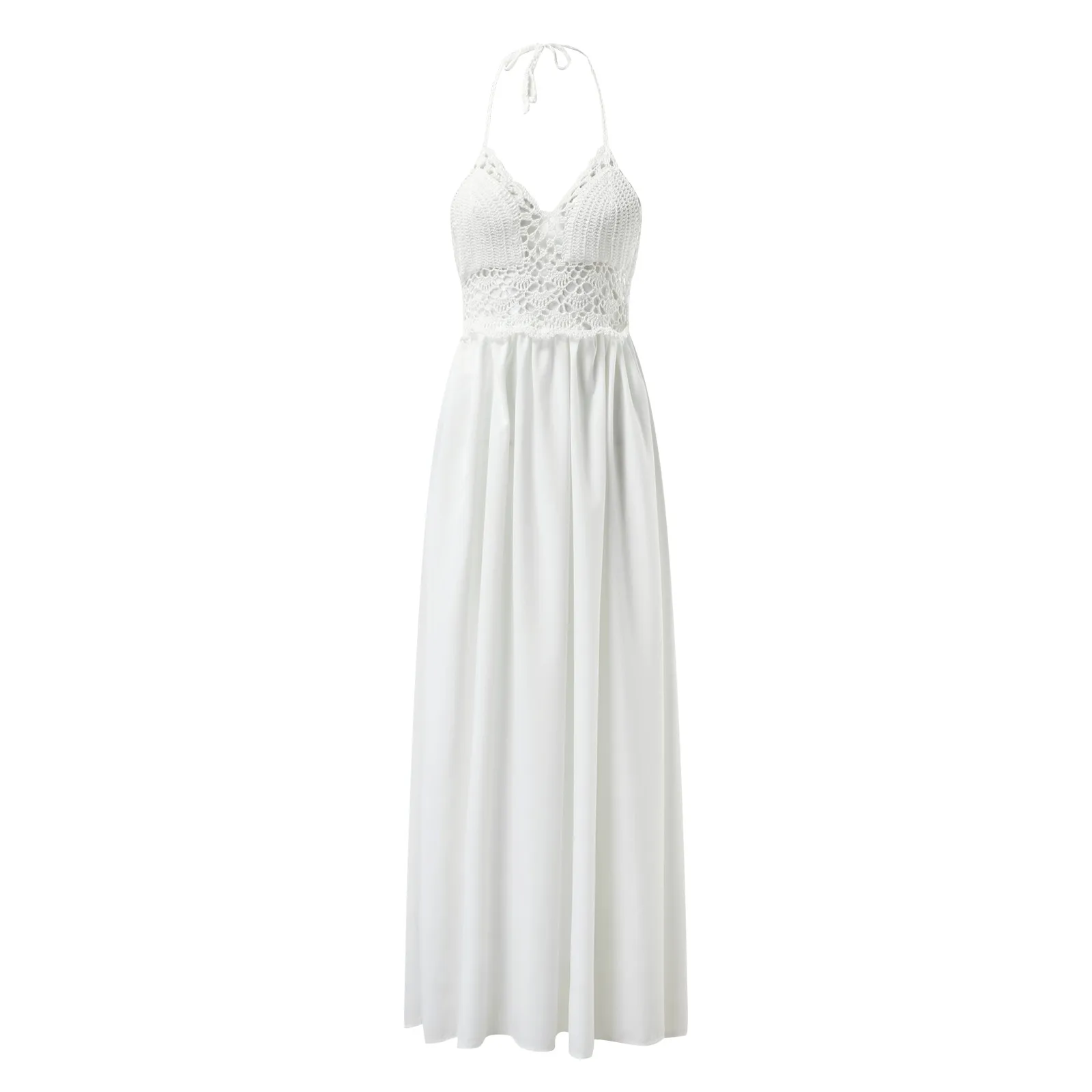 Женское сексуальное элегантное белое кружевное пляжное вязаное крючком платье с открытой спиной богемное длинное платье макси с лямкой на шее платья Элегантное женское платье