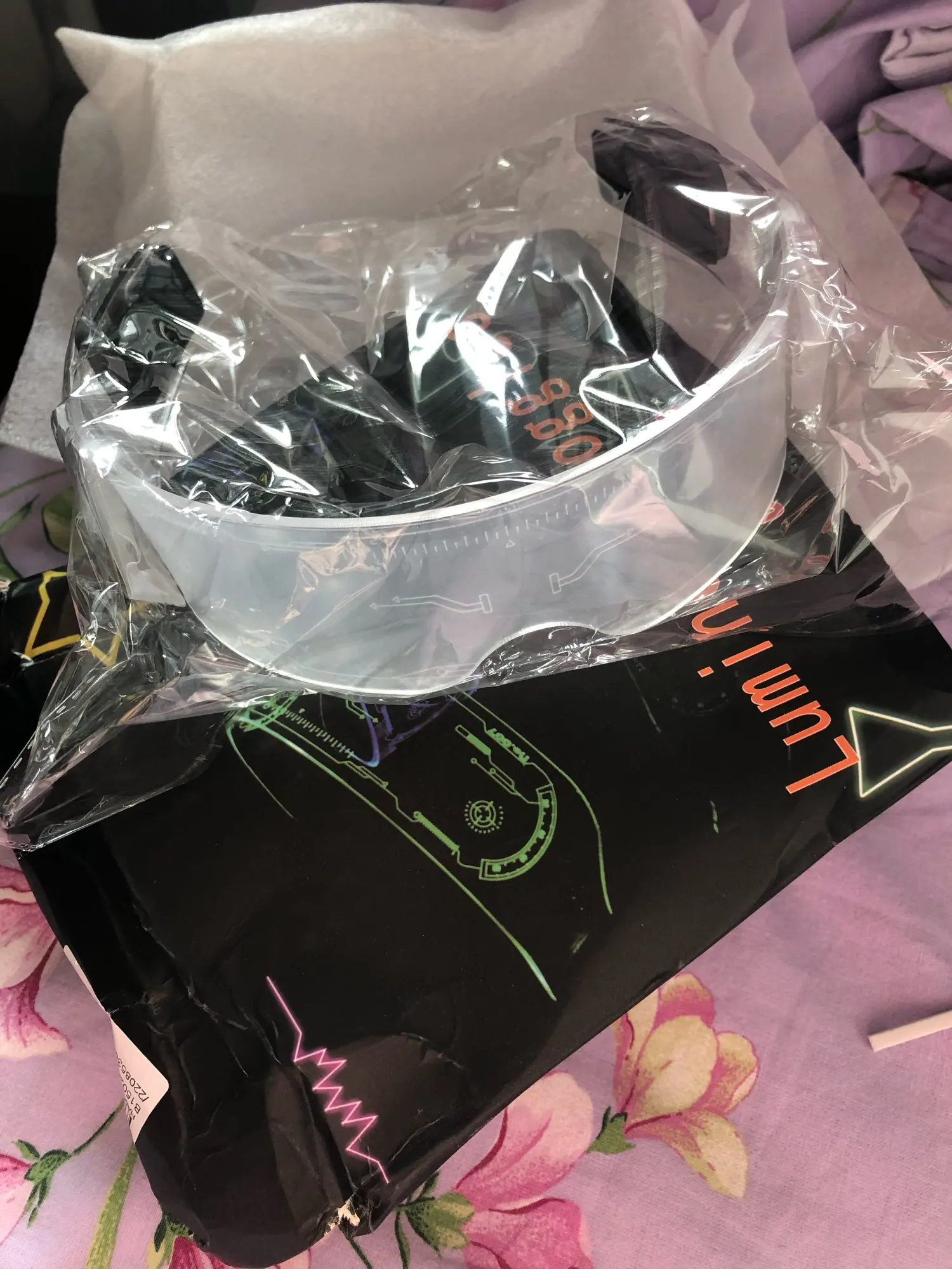 Круть! Всё работает, батарейки установлены, слева и справа отдельно и каждая половина вкл и выкл отдельной кнопкой, переключая на разные цвета и их комбинацию переливаний, и миганий. Выключеные просто как прозрачное оргстекло с нанесенными рисунками.