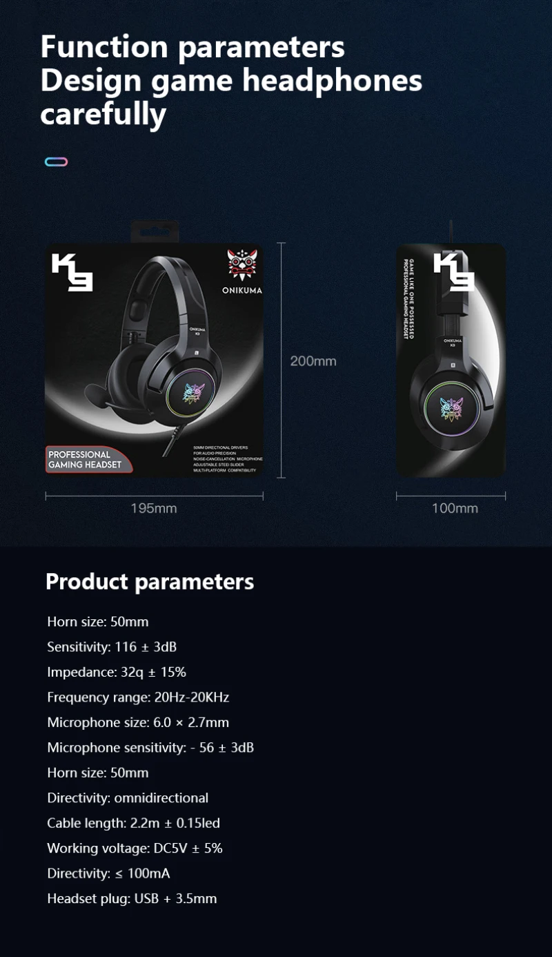 Характеристики:Характеристики: Модель: K9 Цвет: черный Тип наушников: игровые наушники Есть ли микрофон: Да Или для освесветильник атмосферы: Да Длина провода: 2,2 (м) Диаметр динамика: 50 (Φмм) Чувствительность: 116 +/-3 дБ Микрофон: 6,0*2,7 мм Импеданс: 32 Омега +/-15% Направленность: Оми-направленность Сопротивление микрофона: 2,2 к Частотный диапазон: 20 Гц-20 кГц Рабочее напряжение светодиодный да: 5 В постоянного тока Чувствительность микрофона: -56 +/-3 дБ Тип интерфейса: USB + одно отверстие 3,5 мм Вес посылка: около 580 г