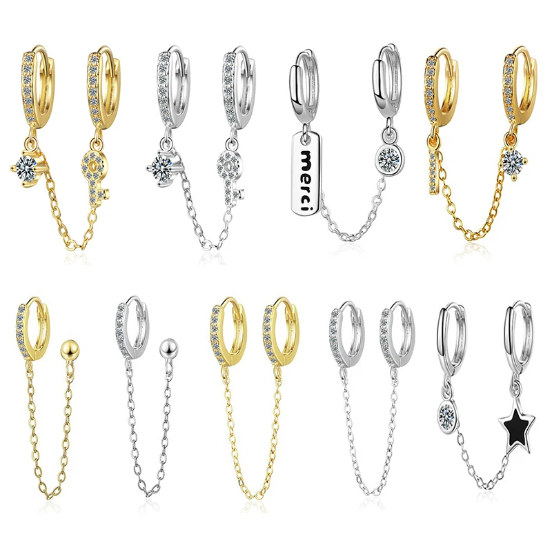 Серьги женские, с двумя отверстиями, с двойной цепочкой, блестящие циркониевые, кольцо с кисточкой, модные праздничные ювелирные изделия