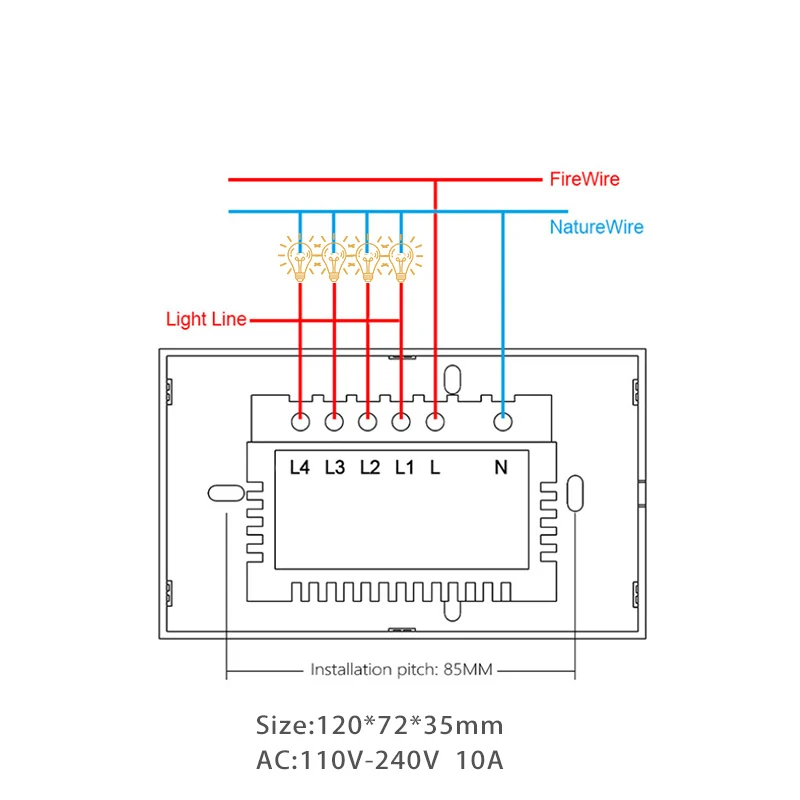 Проводка установки переключателя: N подключен к нейтральному проводу, L подключен к живому проводу, L1L2L3L4 подключен к проводу светильник