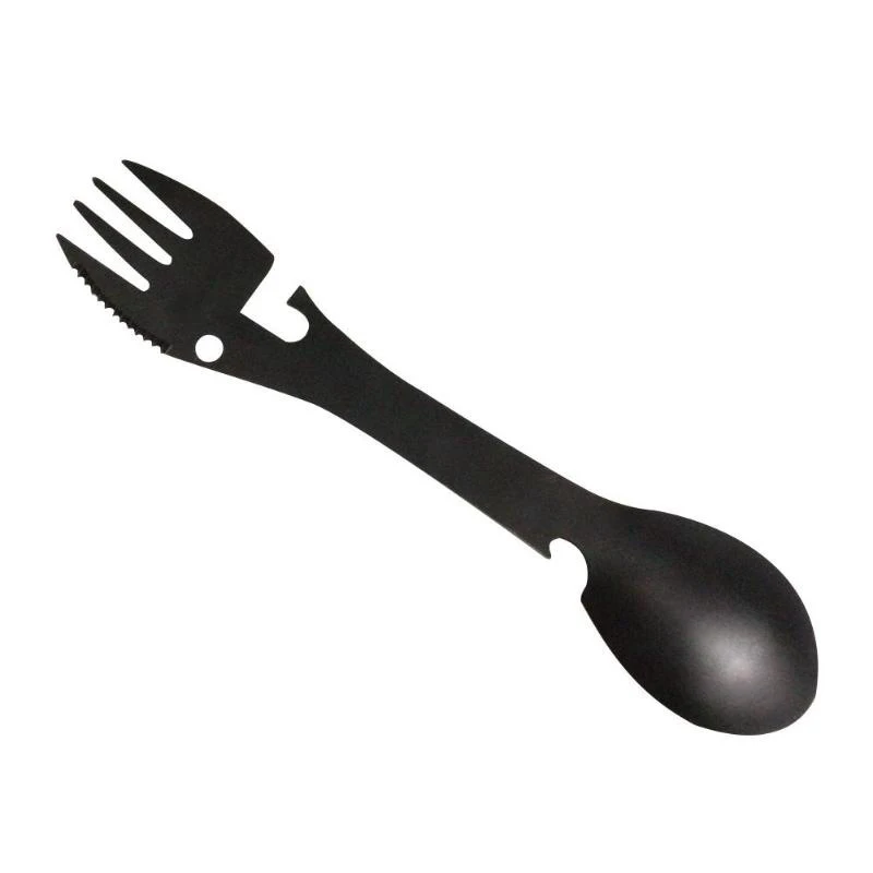 1. Этот многофункциональный инструмент 5 в 1 для повседневного использования на открытом воздухе для кемпинга и пикника делает сложную жизнь простой. 2. Многофункциональный, может использоваться как ложка, вилка, нож (нож для стейка), открывалка для бутылок или консервный нож. 3. Зубчатый резак для резки стейка и колбасы.