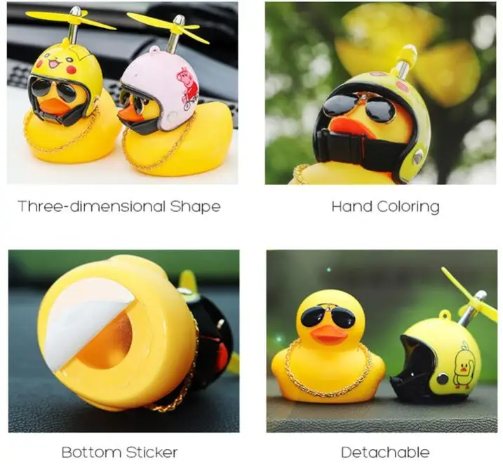 Особенности: Модный крой желтая утка со шлемом. С шлемом, воздушным винтом, солнечными очками, металлической цепочкой для ожерелья, очень круто. Можно использовать как игрушку, как аксессуар или приклеить к машине. Цвет: желтая утка Материал: пластик Посылка тация:1 шт. х шлем Маленькая желтая утка