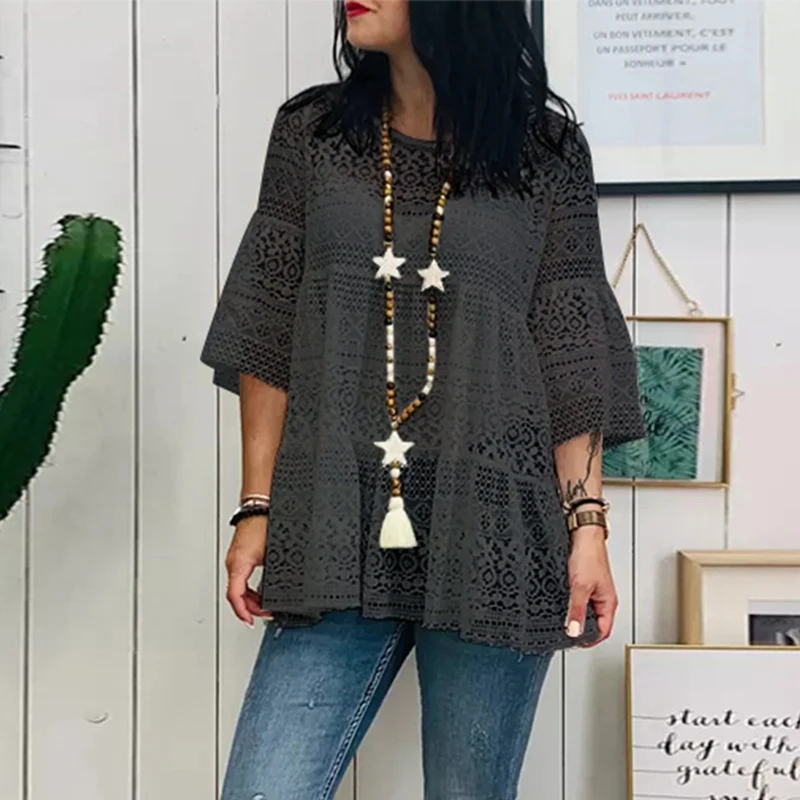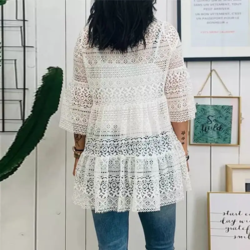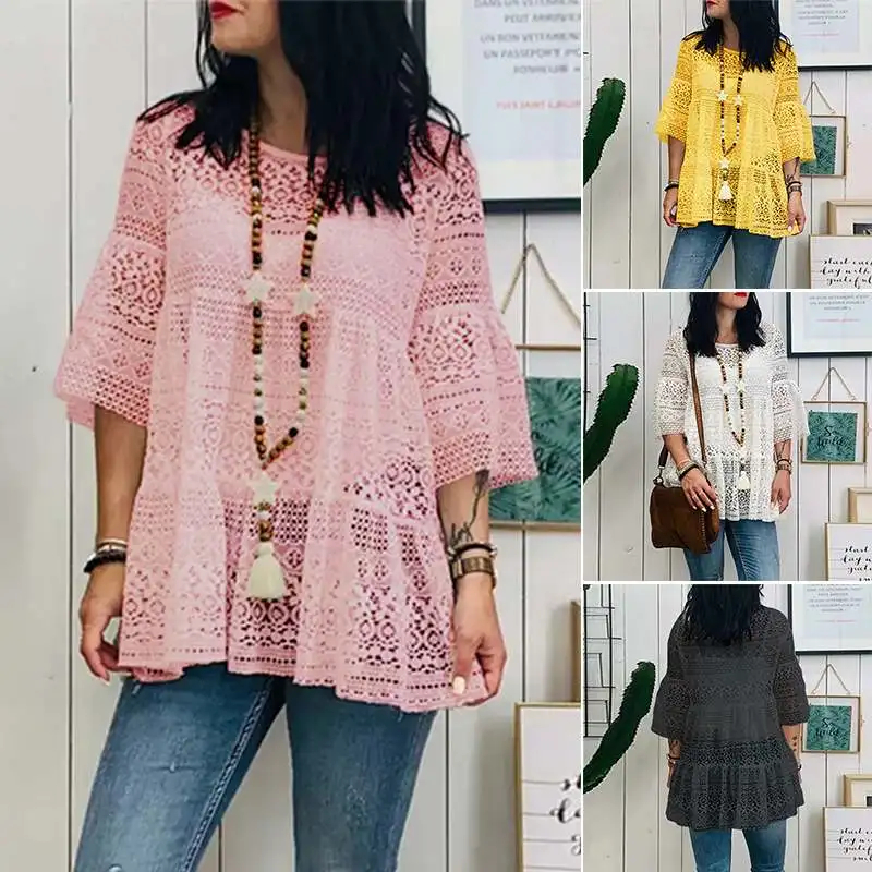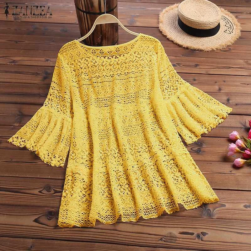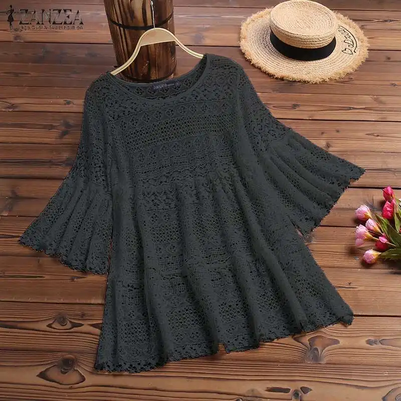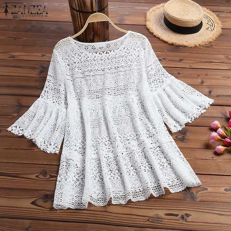 Блузка ZANZEA Женская кружевная в богемном стиле, повседневная ажурная туника с круглым вырезом и рукавом 2021, лето 34
