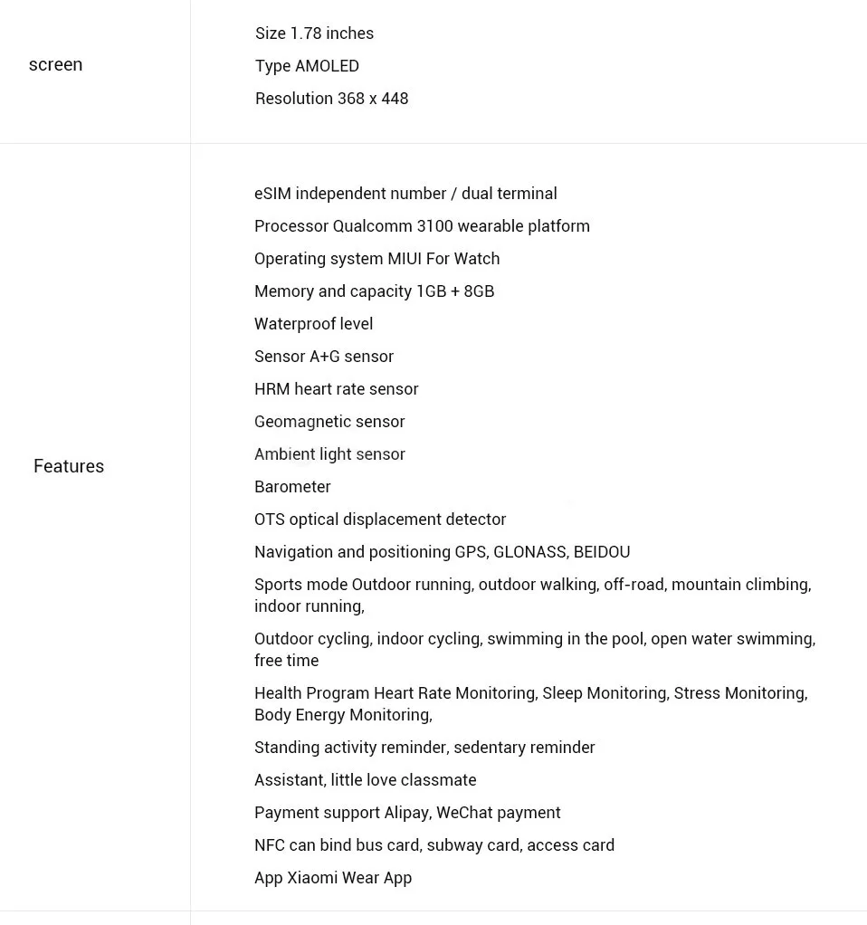 Модель: часы XiaomiВремя работы: 2019.11.5Экран: 1,78 дюйма, AMOLED, 368x448Процессор: Snapdragon Wear 3100 4G ВерсияВодонепроницаемость: защита от плаванияОЗУ + ПЗУ: 1 Гб + 8 ГбДатчик s: A + G Датчик, HRM датчик сердечного ритма, геомагнитный датчик, датчик окружасветильник, барометр, OTS оптический датчик смещенияНавигация: GPS, ГЛОНАСС, BEIDOUСпортивный режим: бег на открытом воздухе, прогулки по улице, по бездорожью, альпинизм, бег в помещении, Велоспорт на открытом воздухе, Велоспорт в помещении, плавание в бассейне, плавание на открытой воде, Бесплатная АктивацияОбнаружение здорового образа жизни: пульсометр, монитор сна, мониторинг стресса, мониторинг энергии тела, напоминание о стоячей активности, напоминание о малоподвижностиNFC: ДаЕмкость аккумулятора: 570mAh(typ), 560mAh(min) (стандартная версия) / 590mAh(typ), 580mAh(min) (версия Pro)Сеть тележек eSIM:WCDMA B1/B5/B8LTE-FDD B1/B3/B5/B7/B8/B18/B19/B20/B26LTE-TDD B39/B40/B41