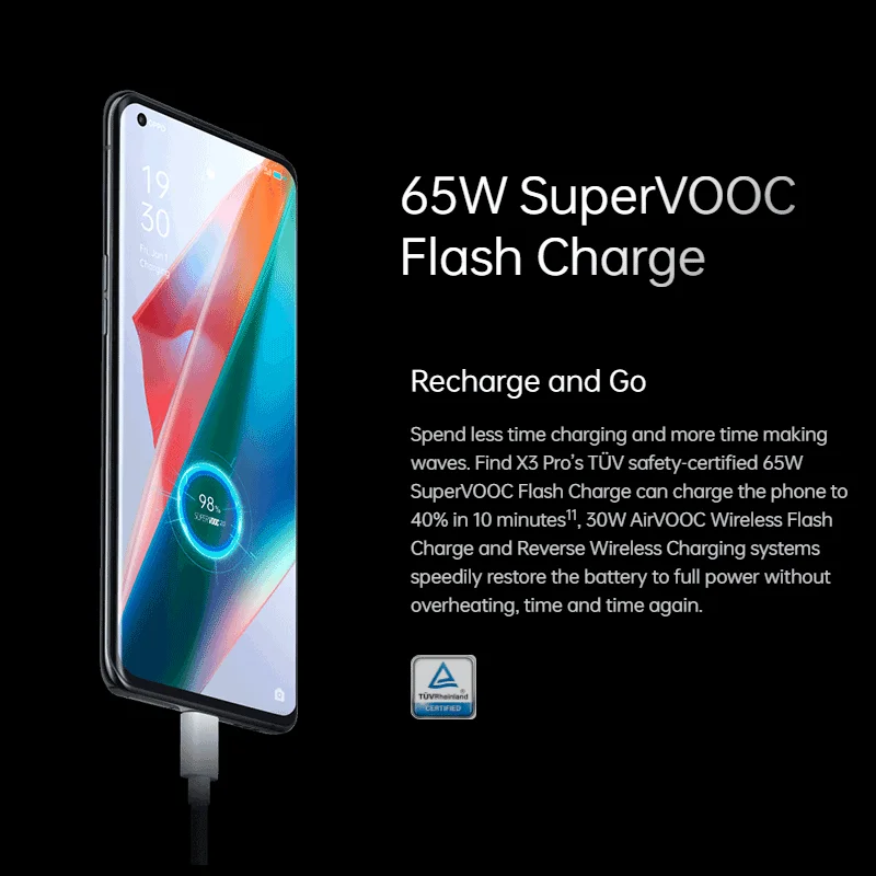 Тратьте меньше времени на зарядку и больше времени, делая волны. Find X3 Pro's TÜV safety-certified 65W SuperVOOC Flash Charge может заряжать телефон до 40% за 10 минут, 30 Вт AirVOOC Беспроводная вспышка и обратная система беспроводной зарядки быстро восстанавливают батарею до полной мощности без перегрева, время и время снова.