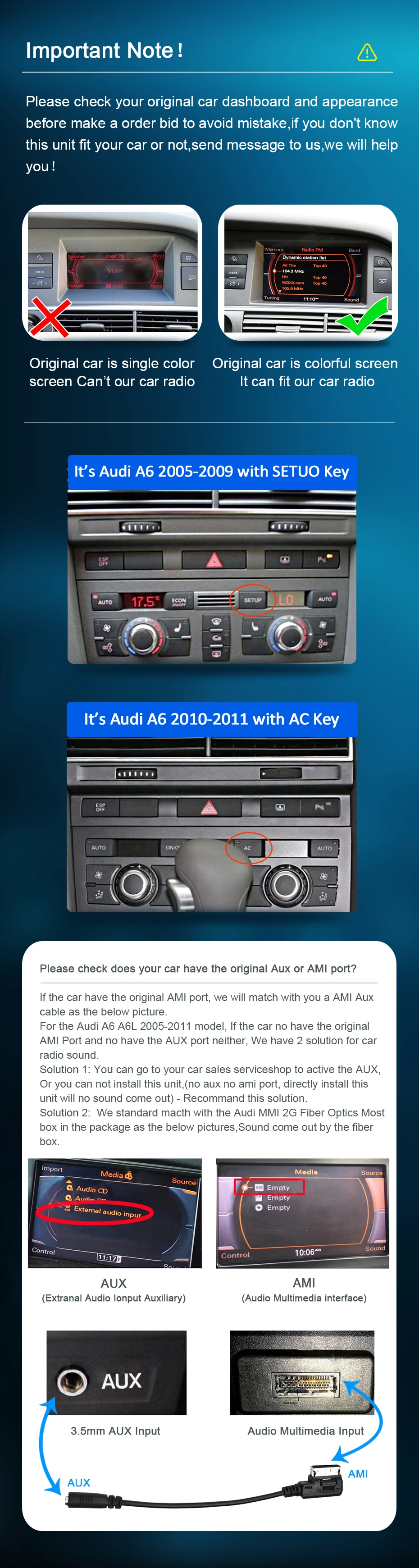 Важное примечаниеПожалуйста, проверьте оригинальную приборную панель автомобиля и внешний вид, прежде чем сделать заказ, чтобы избежать ошибки. Если вы не знаете, что это устройство подходит для вашего автомобиля или нет, отправьте нам сообщение, мы поможем вам.Оригинальный автомобиль с одним цветным экраном не подходит для нашего автомобильного радиоОригинальный автомобиль-это цветной экран, который подходит для нашего автомобильного радио.