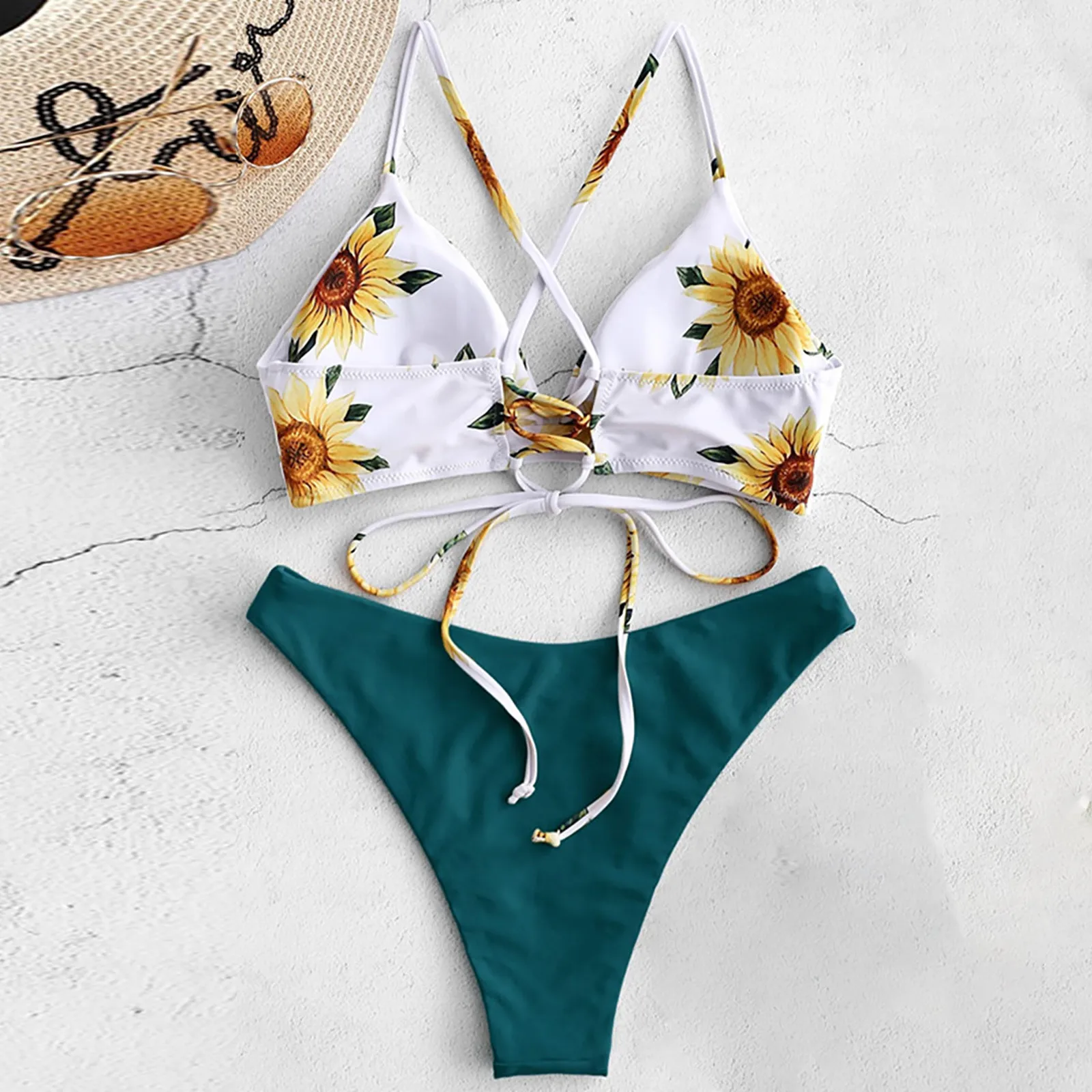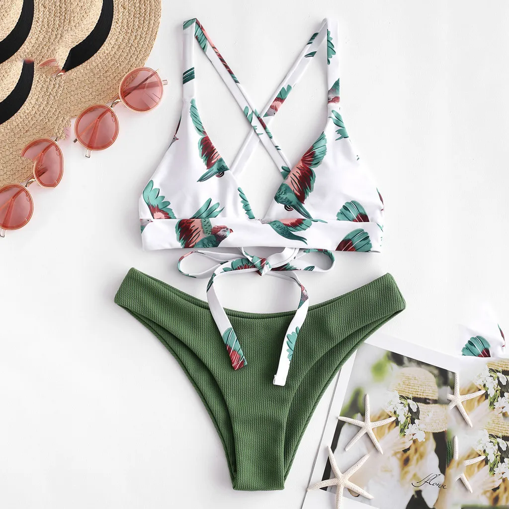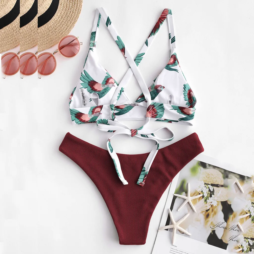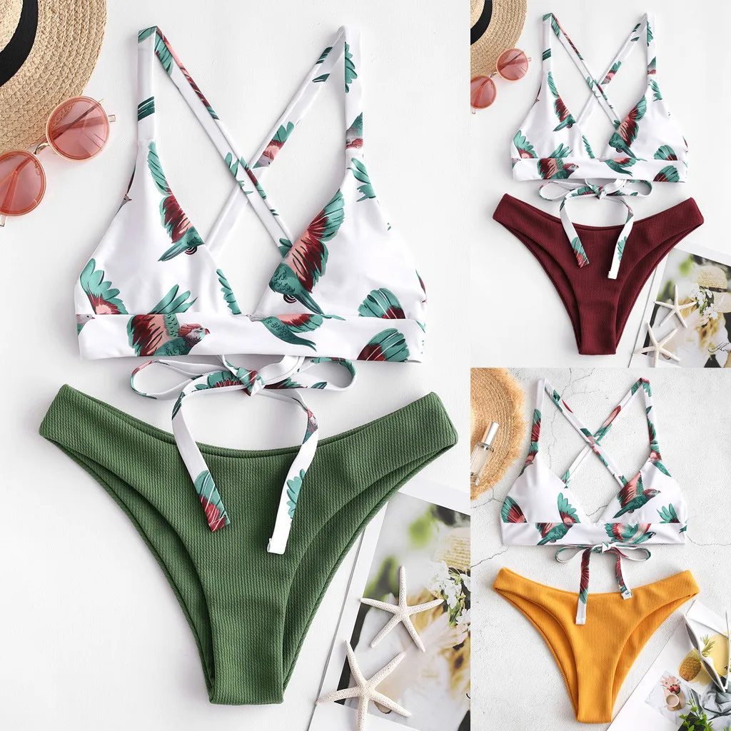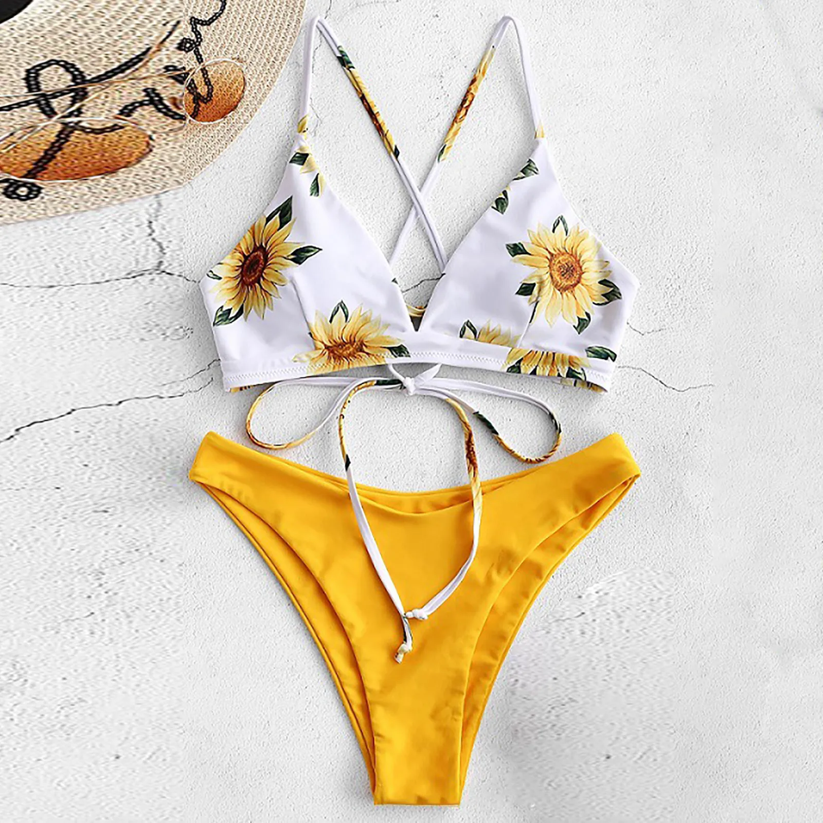 Комплект бикини женский с цветочным принтом, купальники из 2 предметов, пуш-ап, бандо, Топ бикини, полное покрытие, средняя талия